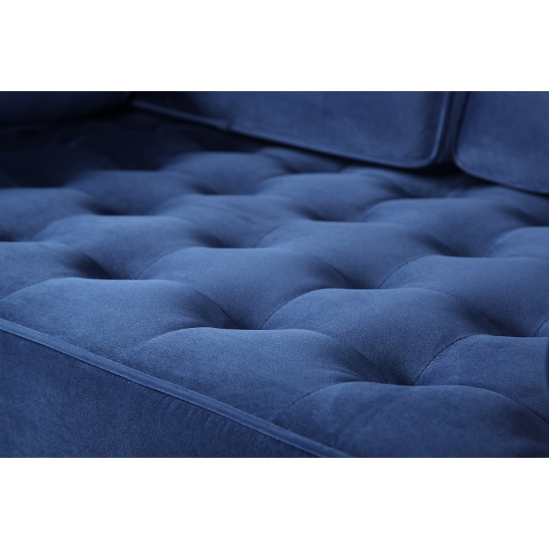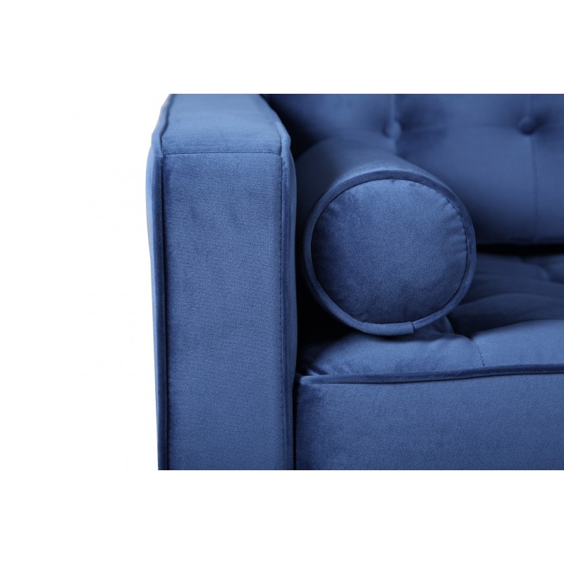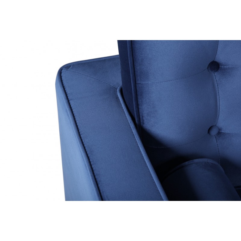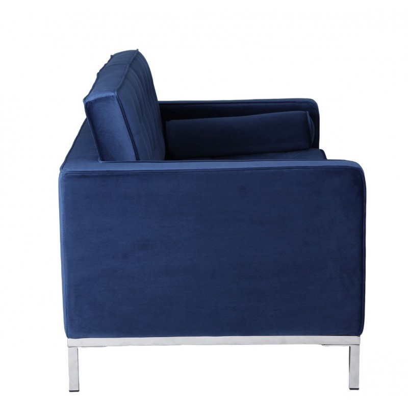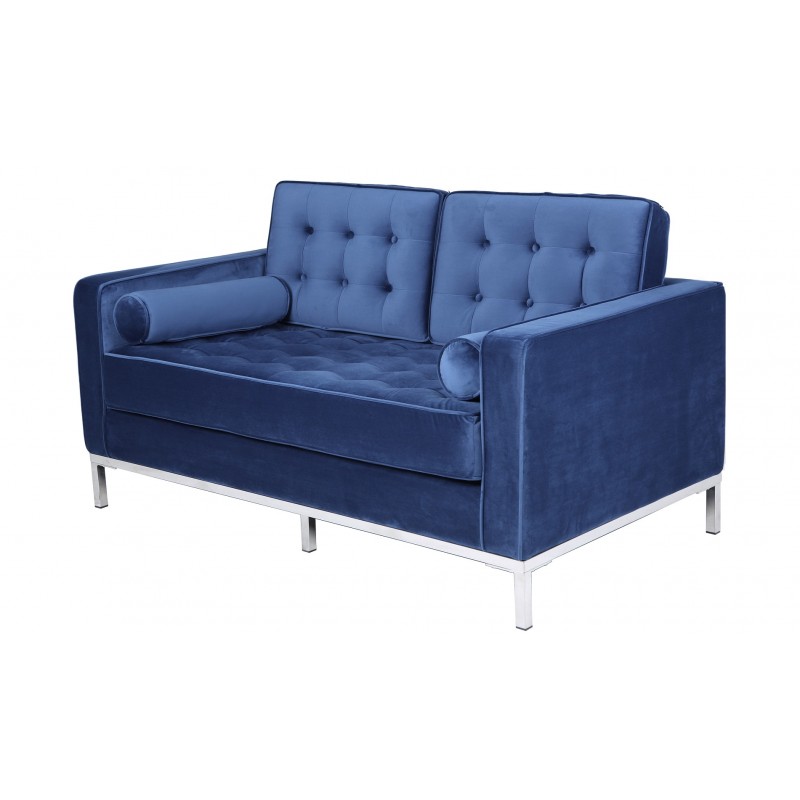 The sofa is upholstered in high-quality blue velvet fabric, offering a beautiful texture and excellent durability. The shiny stainless steel base highlights the modern character of the furniture while ensuring great stability.