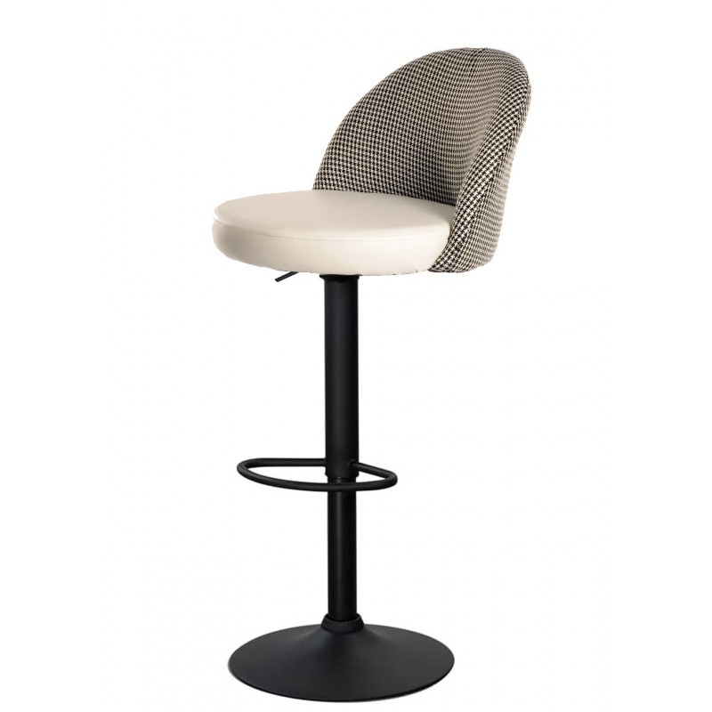Adjustable Bunden bar stool, black base, houndstooth upholstered seat and white fabric