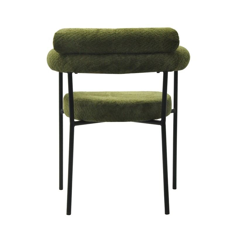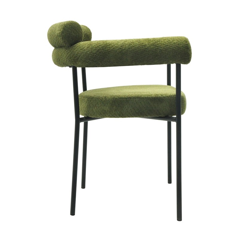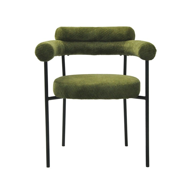 The structure is based on sturdy metal, ensuring strength and durability over time. The dark green loop fabric upholstery offers a pleasant touch and good resistance to wear. This choice of materials gives the armchair a contemporary and warm look.
