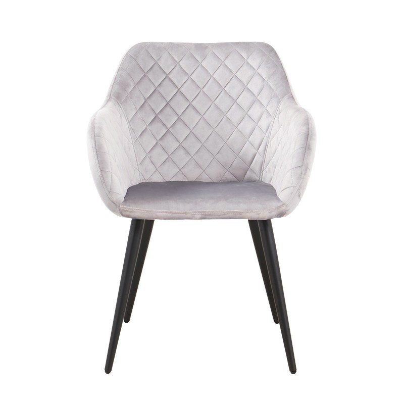 This armchair fits perfectly in dining, hospitality, or office spaces, providing comfort and style with its light gray velvet upholstery.