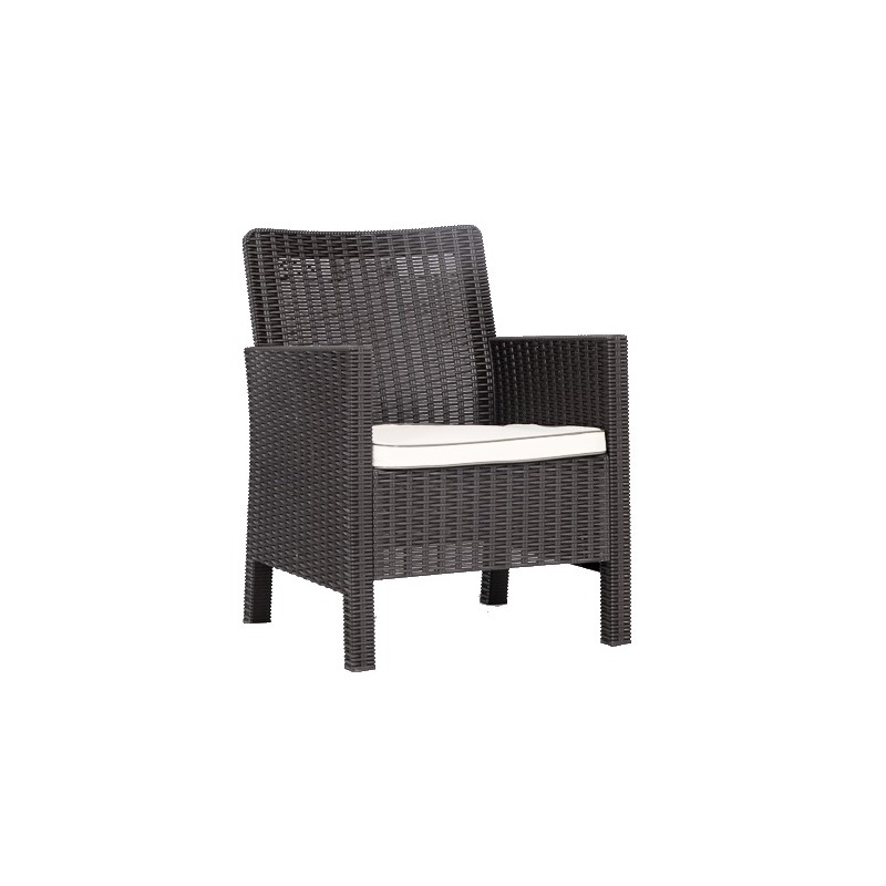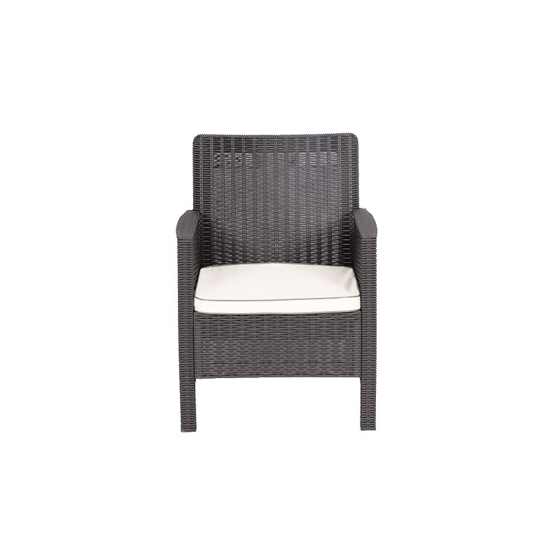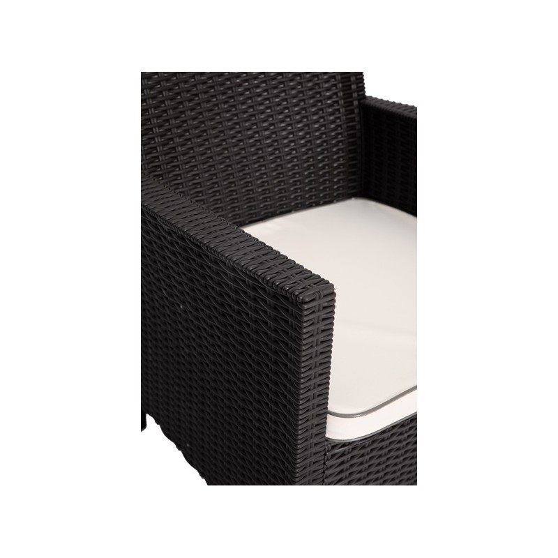 The structure is made of chocolate brown tinted polypropylene, known for its strength and lightness. Its design through assisted injection ensures increased strength and a neat finish. The beige cushion provides additional comfort and is easy to maintain. The set mimics the appearance of rattan, offering a natural touch without the constraints of organic material.