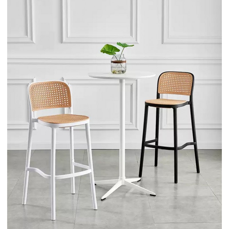 The structure is made of black polypropylene, ensuring lightness and strength. The seat and backrest are also made of polypropylene, with a beige finish that adds an elegant contrast. The gas-assisted injection process enhances the stool’s resistance while maintaining a moderate weight. This material offers good resistance to external aggressions, particularly UV rays.