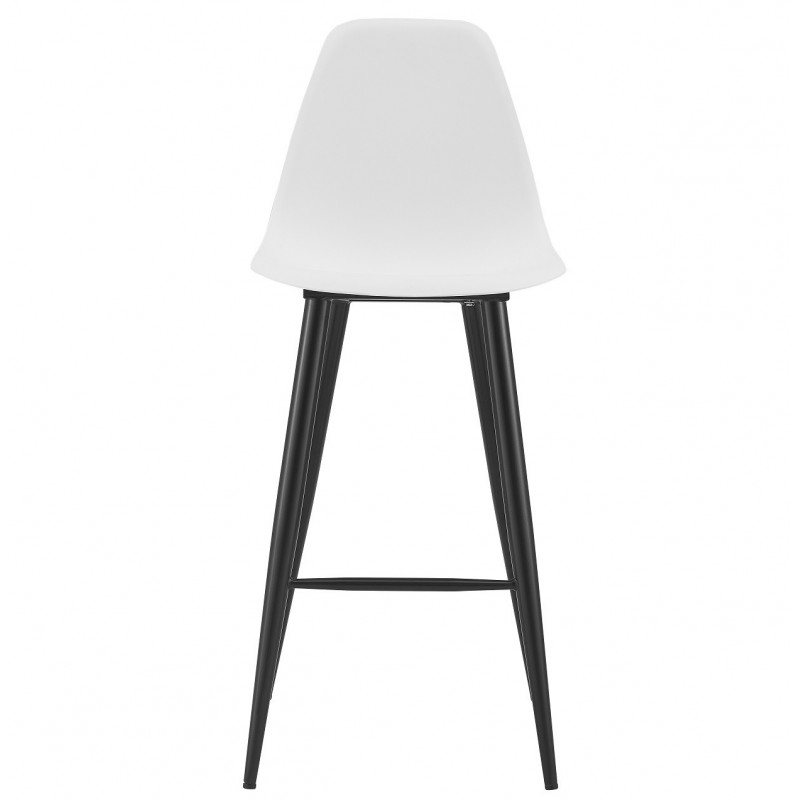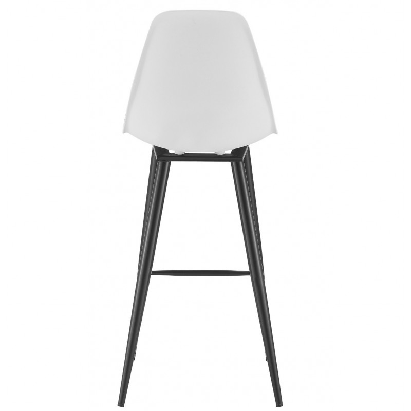 The white polypropylene seat ensures a resistant, easy-to-clean, and pleasant-to-touch surface. The structure is supported by four metal legs, treated with a black epoxy finish to ensure strength and protection against wear. This combination of materials gives the stool excellent stability and great durability over time.