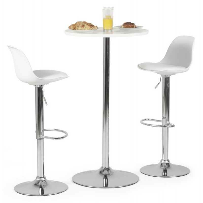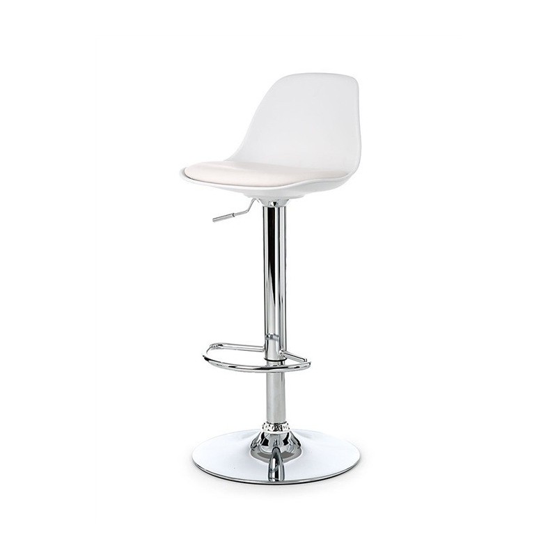 The structure is based on a chrome metal column and base, ensuring stability and durability. The seat combines white injected polypropylene, easy to maintain, with a white faux leather cushion providing comfort and elegance. The integrated footrest optimizes ergonomics during prolonged use. The height adjusts easily thanks to a gas system, ensuring precise and smooth adjustment.