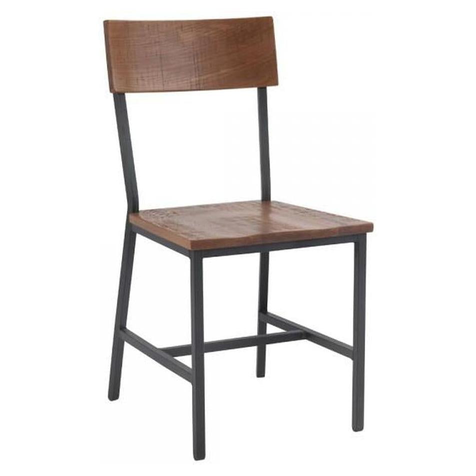 This black metal chair with a distressed red oak seat is designed for professional use,