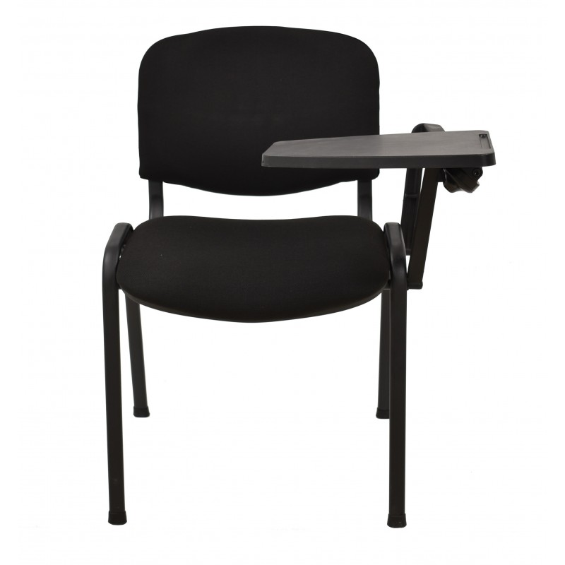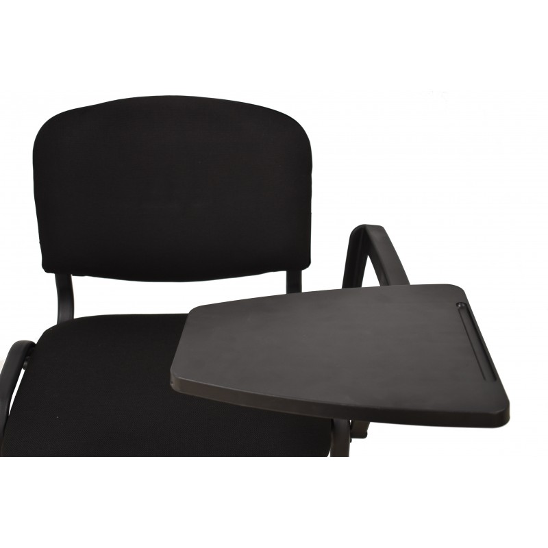 The structure is based on a black epoxy-coated oval tube frame, ensuring strength and stability. The seat and backrest are covered in black acrylic fabric, washable and resistant to daily use. A protective cover is present on the back and under the seat, safeguarding the chair against impacts and wear. The left armrest is made of polypropylene and features a foldable ABS writing tablet, designed for easy and secure use.