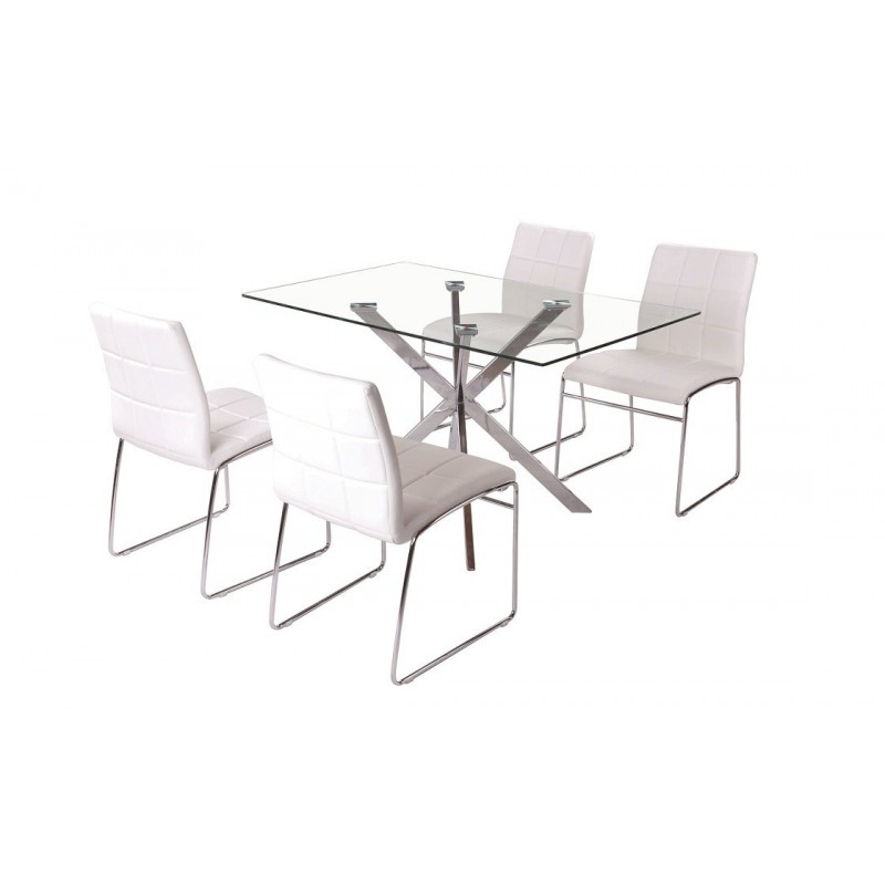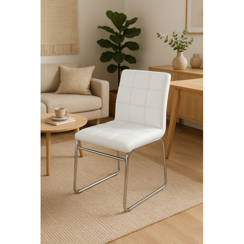 The structure is based on a fixed chrome tube base with a diameter of 16 mm, ensuring stability and resistance. The seat and backrest are covered in white faux leather, offering a pleasant and easy-to-clean surface. The combination of lightness and strength allows for easy handling.