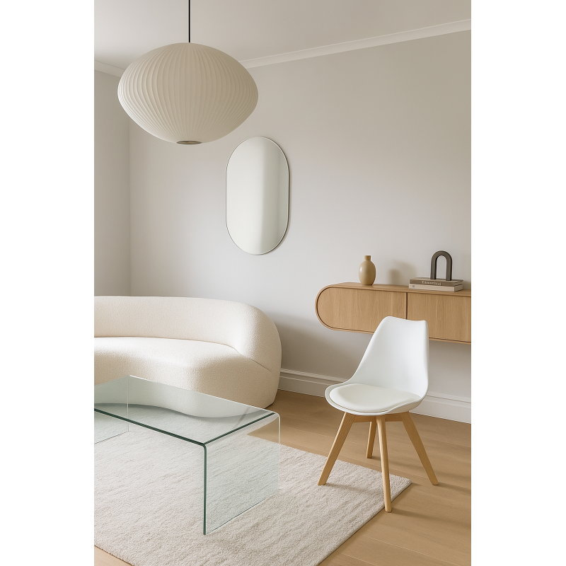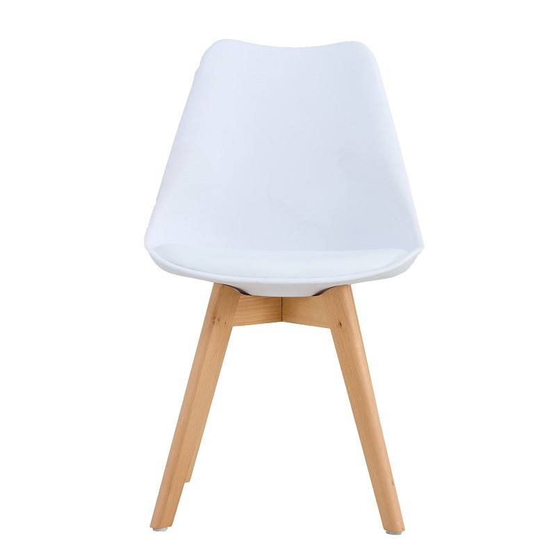 The structure is supported by four solid wood legs, ensuring stability and robustness. The white polypropylene shell provides lightness and ease of maintenance. The seat features a padded cushion in white faux leather, enhancing comfort without compromising style. The combination of wood and polypropylene gives this chair a balance between durability and aesthetics.
