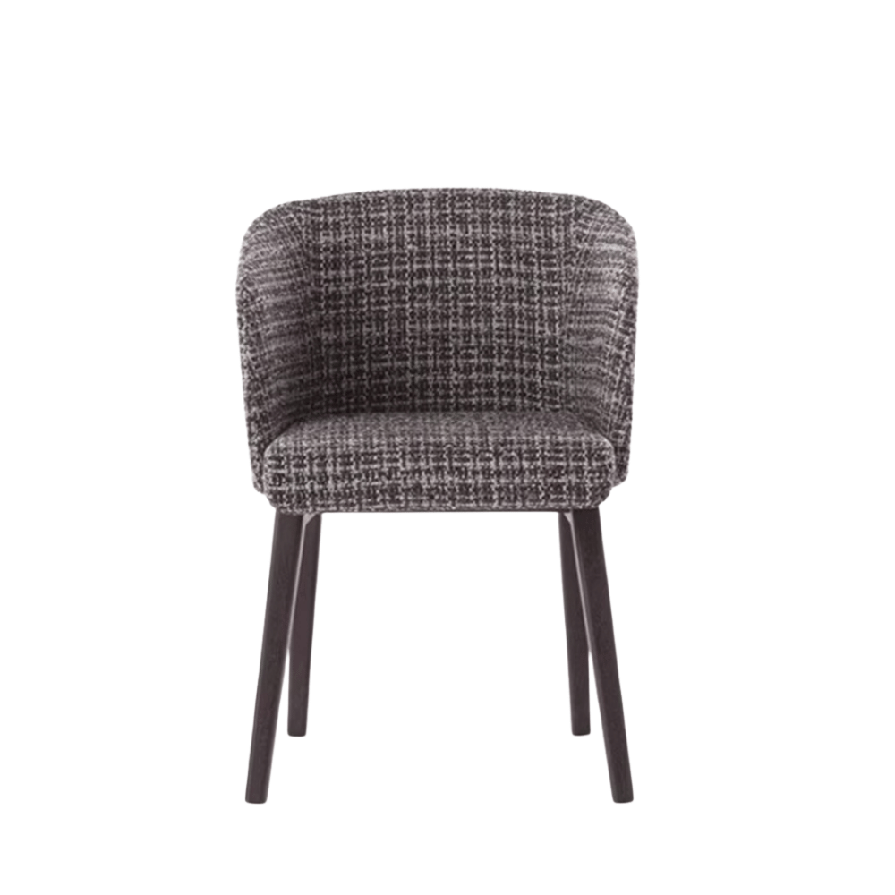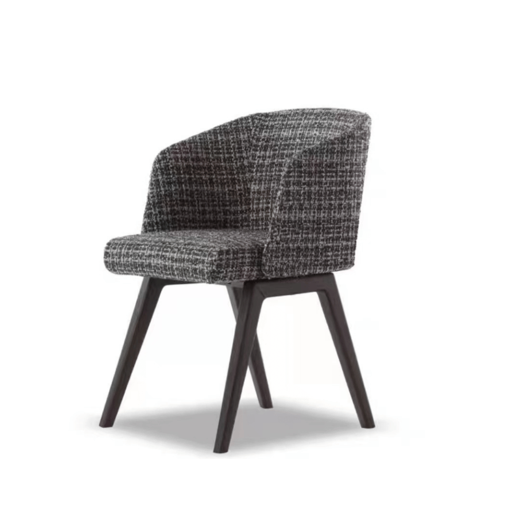 The chair’s structure is made of ash wood, ensuring remarkable stability and durability. Its high-density polyurethane foam padding provides lasting comfort, even after prolonged use. The upholstery is available in fabric or faux leather, offering a refined look while being easy to maintain.