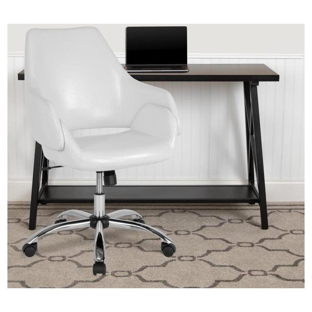 This upholstered mid-back office and home chair is designed to provide comfort and functionality,