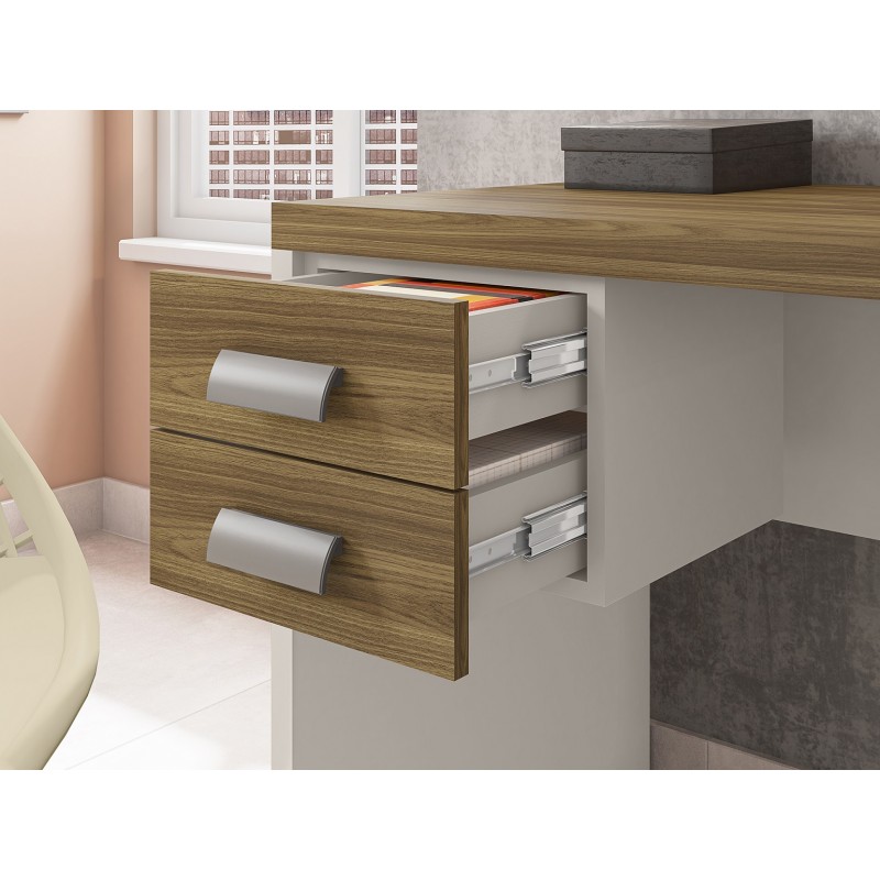 The 40mm thick melamine-coated top ensures excellent resistance to impacts and wear, while the 25mm melamine-coated sides provide strength and stability. The drawers slide on telescopic metal runners, ensuring smooth and durable use. The whole desk rests on a sturdy structure designed for intensive use in a professional environment.