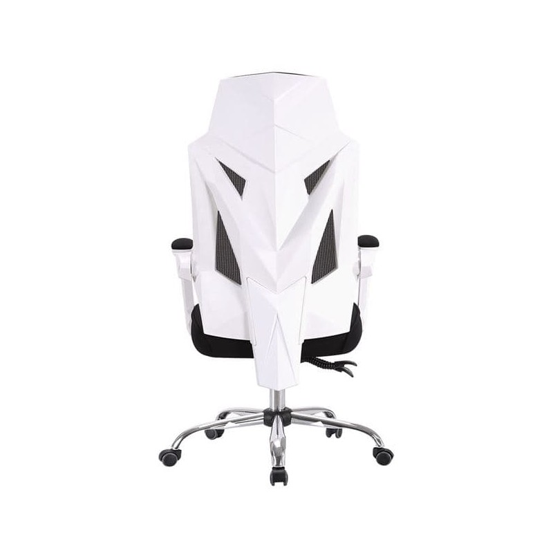The structure is based on a white polypropylene frame, ensuring strength and lightness. Its chrome base not only provides great stability but also a neat aesthetic. The backrest is covered in breathable gray mesh fabric, while the seat and headrest benefit from a comfortable and durable black fabric covering. This choice of materials offers a perfect balance between resistance and ergonomics.