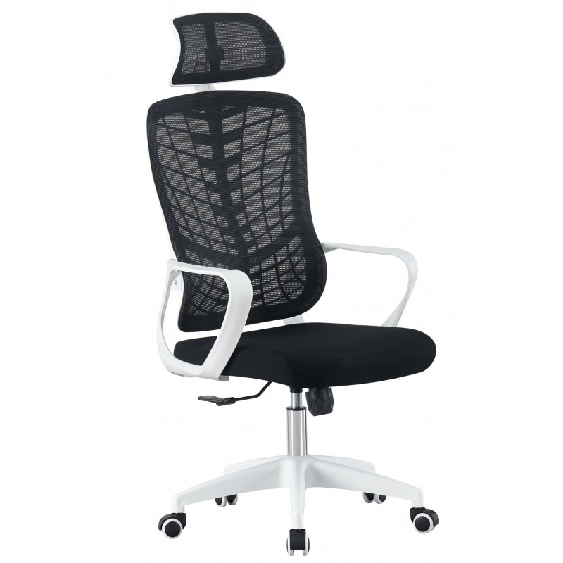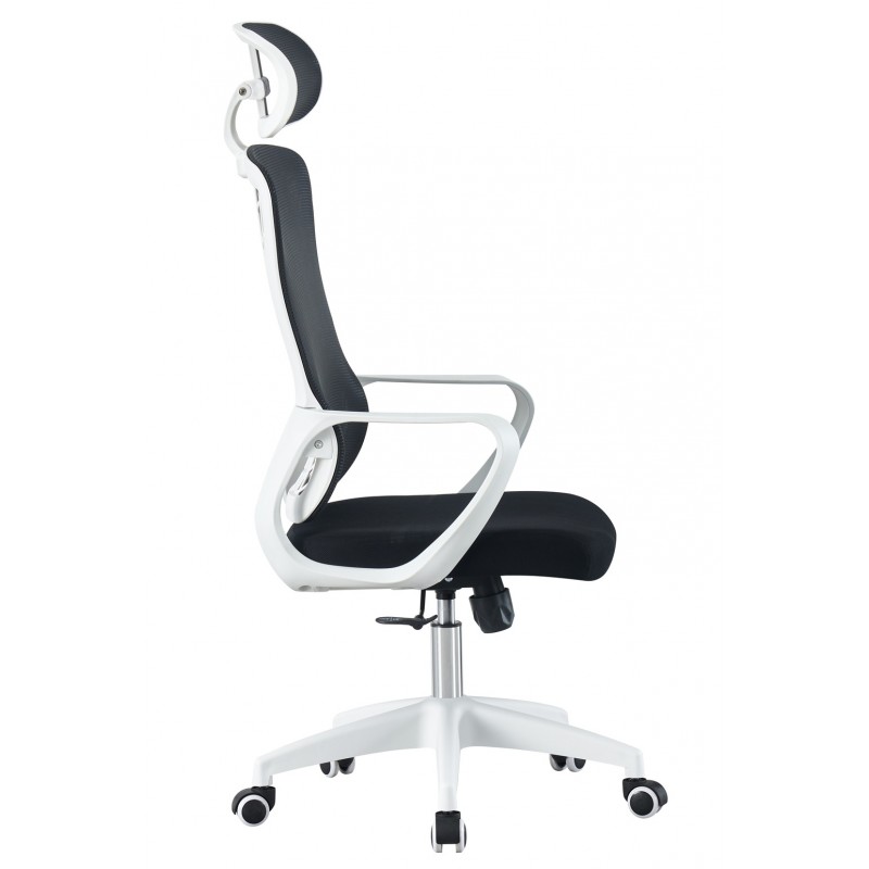 The structure is based on a white nylon frame, ensuring robustness and lightness. The high backrest, equipped with a headrest, is covered with a black translucent mesh fabric that provides excellent breathability. The seat, covered in black fabric, offers a comfortable and durable surface for intensive use. The stable and solid white nylon base supports a set of 50 mm Silent Nylon soft casters, suitable for hard and sensitive floors. The combination of carefully selected materials is designed for durability and easy maintenance.