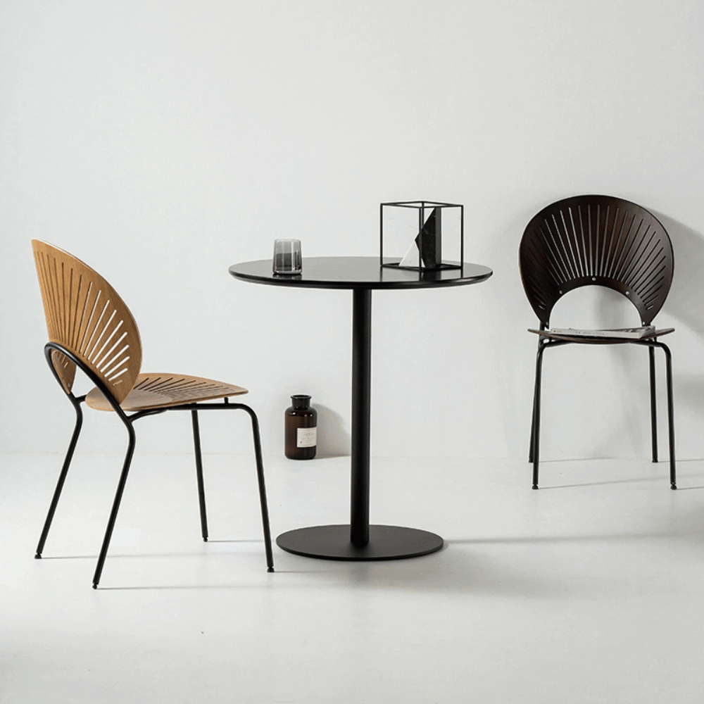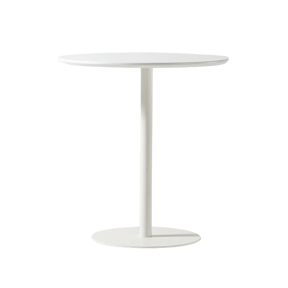 The table features a blister top, known for its stain and wear resistance, while being easy to clean. Its base is made of strong steel, providing optimal stability. The lacquered finishes add an elegant touch to the overall look.