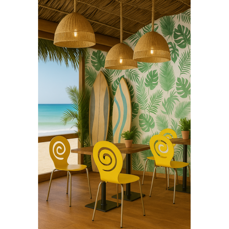 This chair fits perfectly in professional environments requiring functional and colorful furniture, especially for dining areas, waiting rooms, or events.