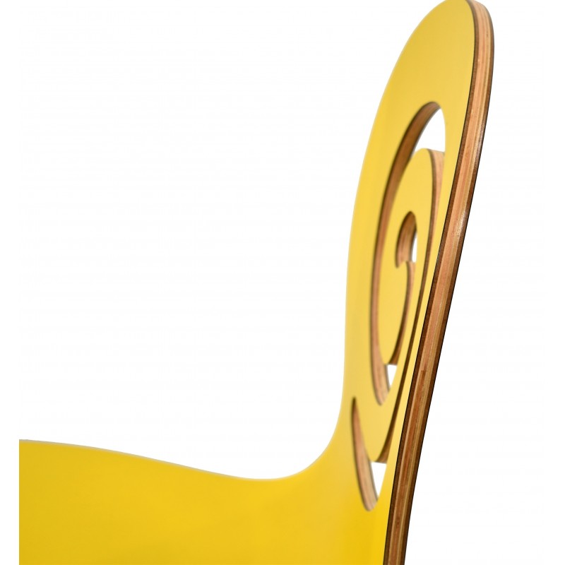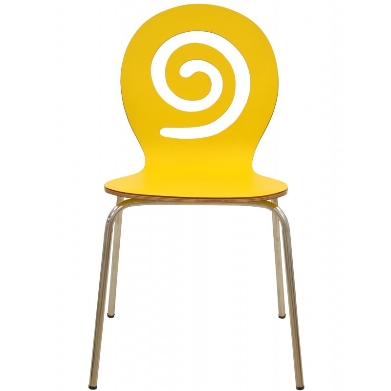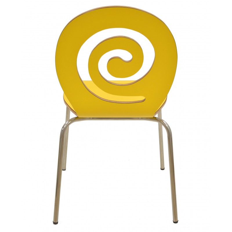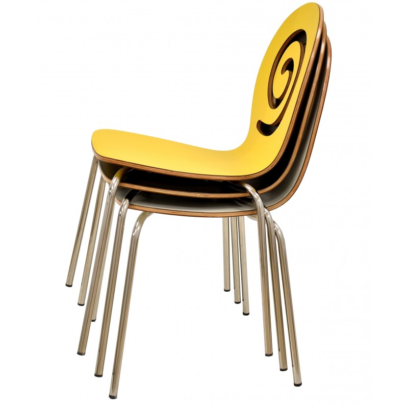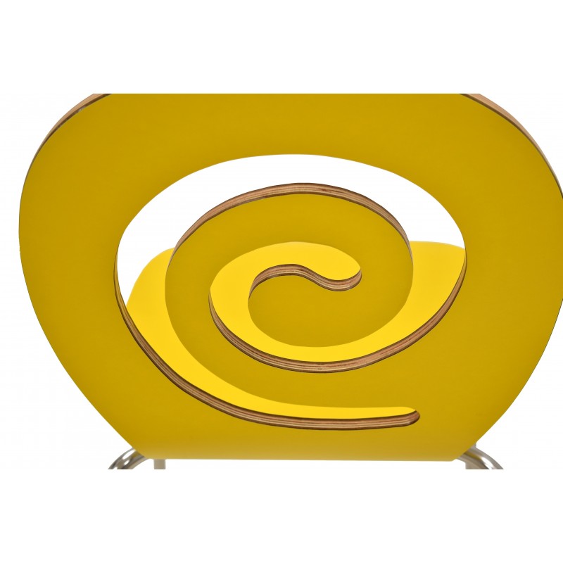 The structure is based on a 19 mm diameter stainless steel tubular frame with a thickness of 1.5 mm, ensuring strength and corrosion resistance. The seat consists of curved plywood covered with yellow HPL laminate, providing a durable and easy-to-clean surface. These materials ensure excellent durability even with heavy use.