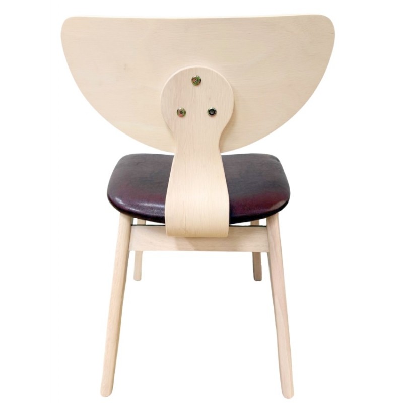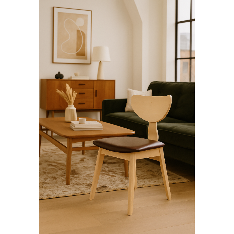 The varnish applied to the wood ensures lasting protection against wear and moisture. The brown faux leather combines comfort and durability, suitable for intensive use. Each chair benefits from careful finishing, guaranteeing a uniform appearance and extended robustness.