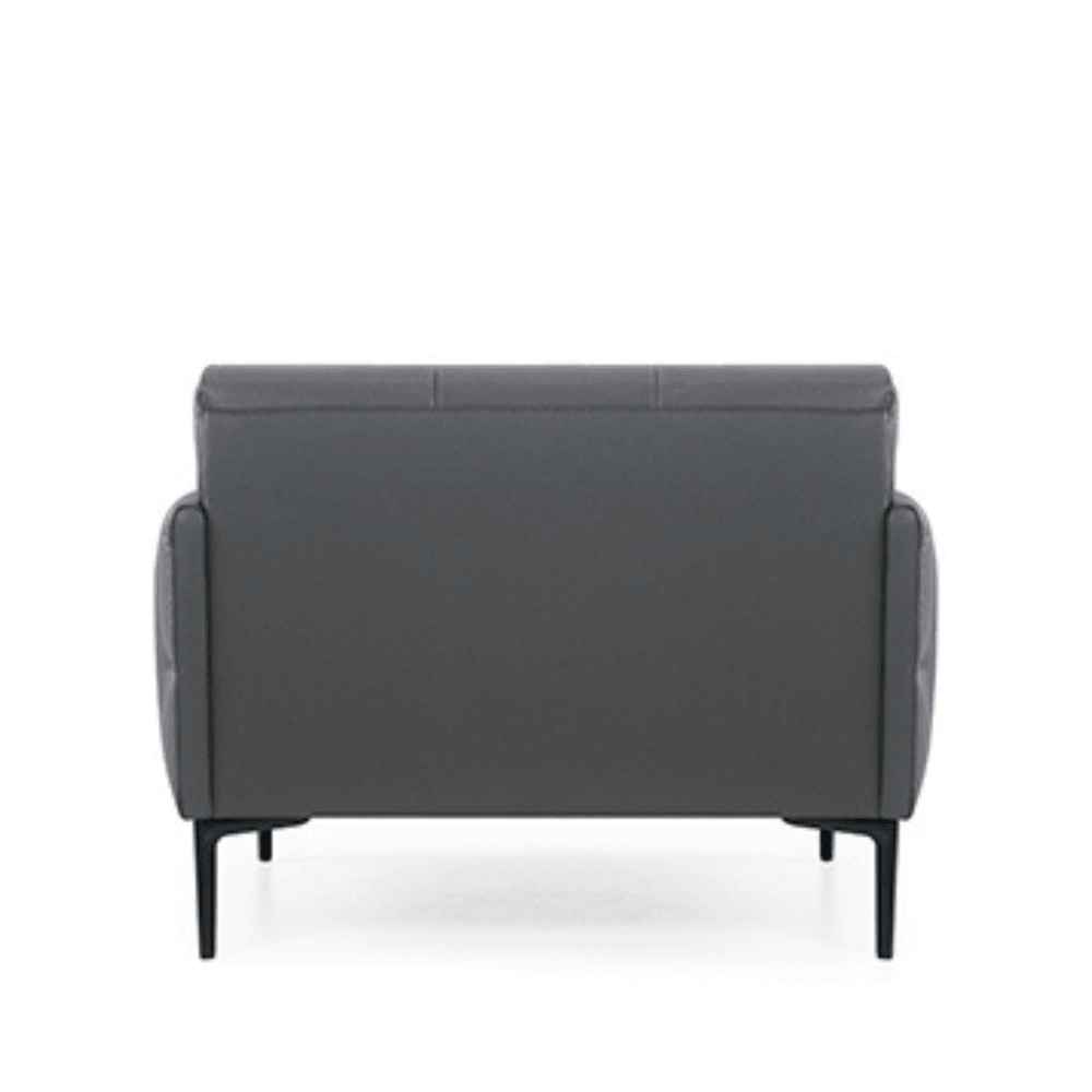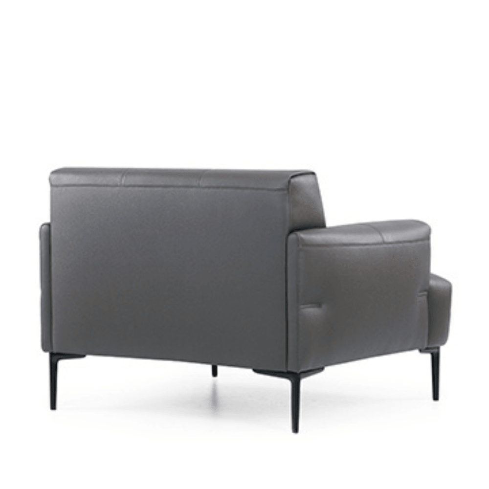 The armchair is upholstered in high-quality leather, combined with high-density foam for lasting comfort. Its structure rests on a painted black metal base, ensuring stability and robustness. The fixed leather armrests add a touch of sophistication while providing pleasant support.
