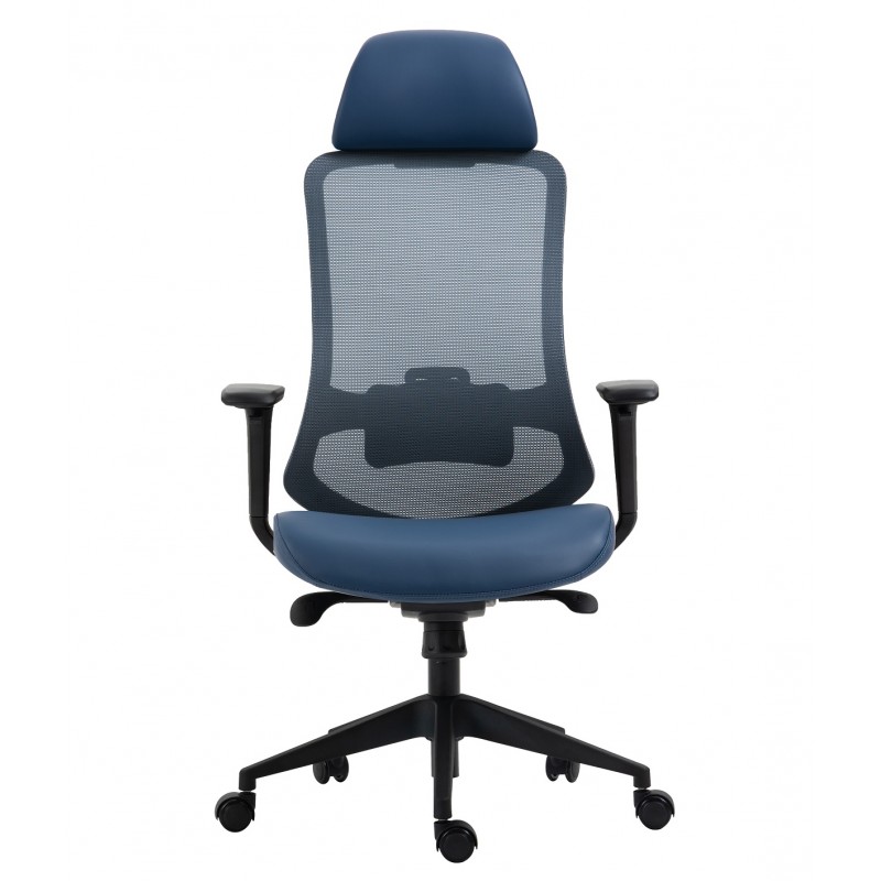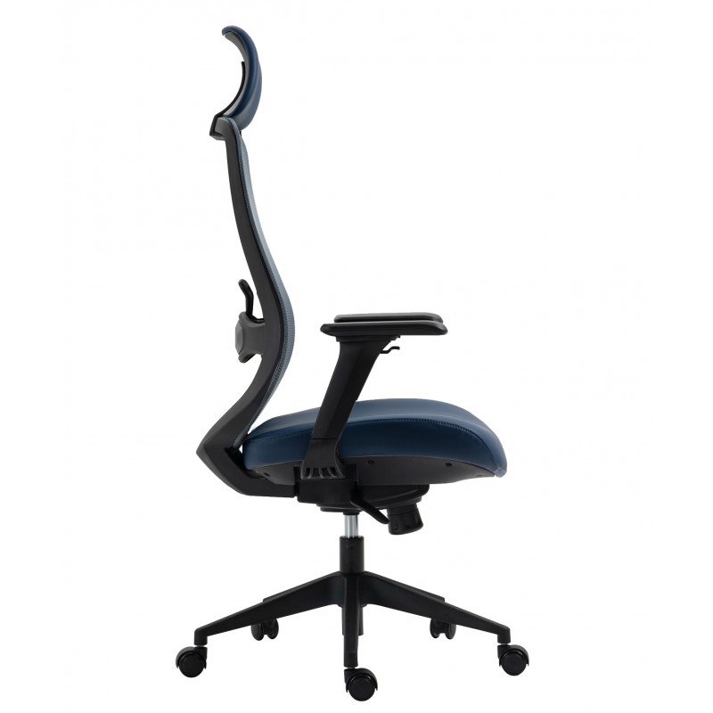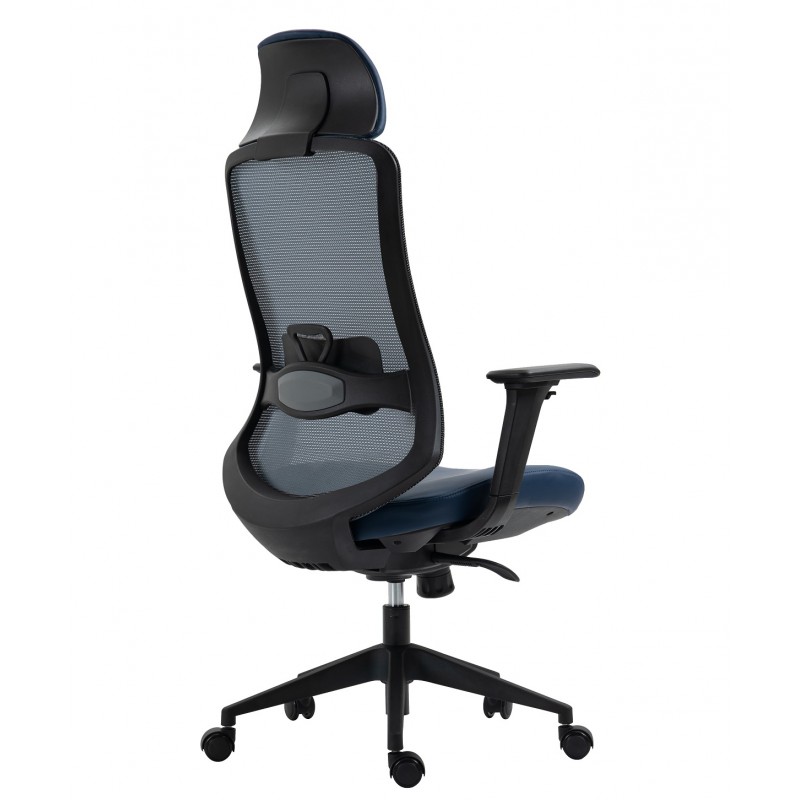 The structure is based on a black nylon frame, ensuring strength and lightness. The very high backrest, extended by an adjustable headrest, provides optimal support for the neck and head. The seat combines a blue synthetic leather covering and memory foam, ensuring lasting comfort. The blue translucent mesh backrest promotes good ventilation, reducing the feeling of humidity.