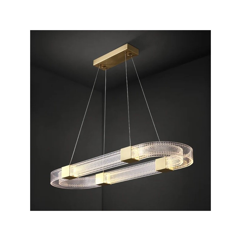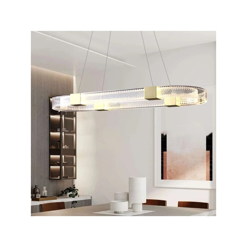The pendant light combines a sturdy metal structure with an acrylic diffuser, ensuring lightness and durability. The golden finish brings a luxurious and contemporary look, while withstanding professional use conditions. The one-meter suspension cable allows for easy height adjustment according to specific space requirements. Each material has been selected for its aesthetics and durability, ensuring long-lasting use.