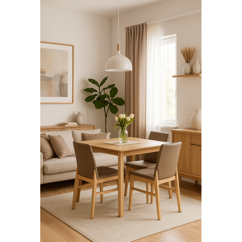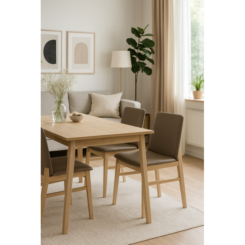 The wood has a natural varnish that protects the surface while maintaining the warm look of the material. The brown faux leather has a pleasant texture and is easy to clean. Every detail is carefully crafted to ensure durability over time, even with heavy use.