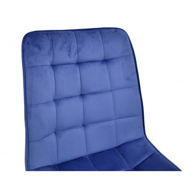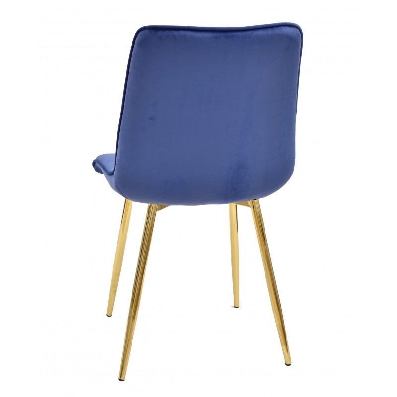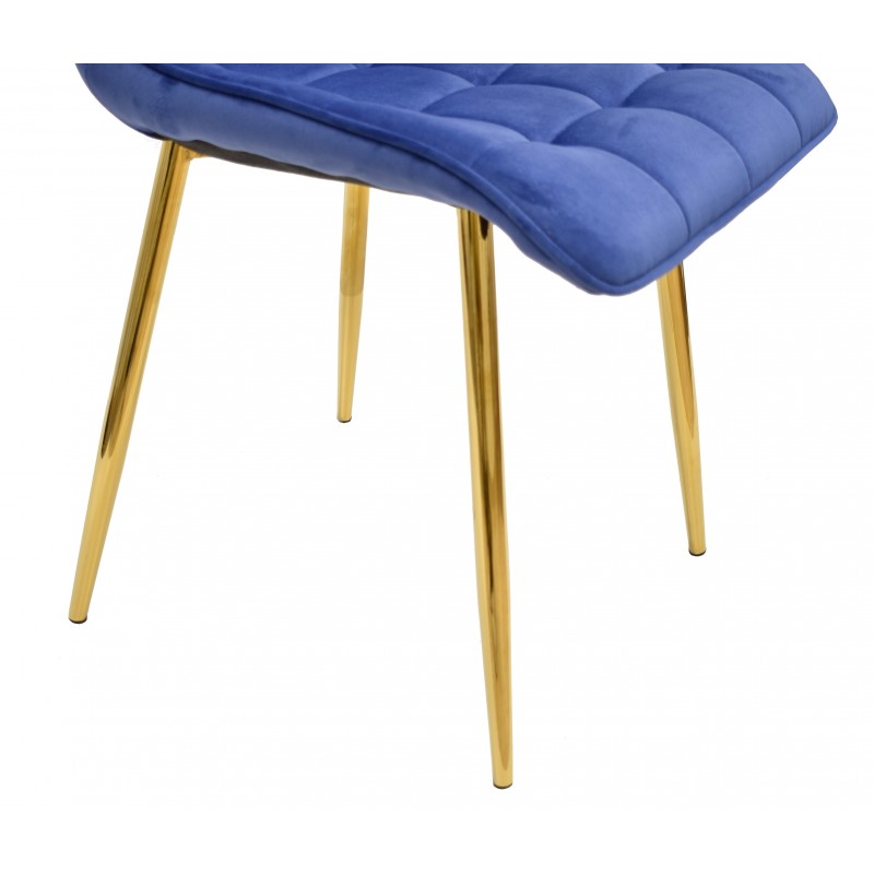 The metal structure ensures great strength while maintaining appreciable lightness. The metal has a golden finish that adds a touch of refinement and modernity. The seat and back are covered in blue velvet, a material that is both soft and durable, providing a pleasant sensation to the touch.