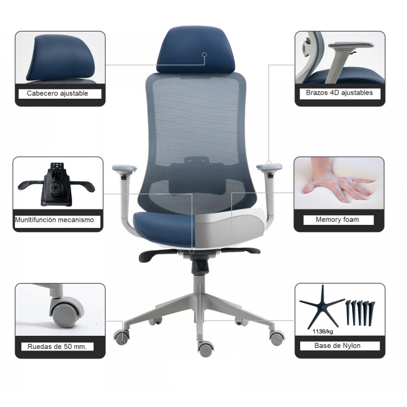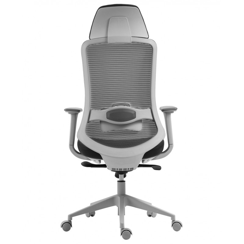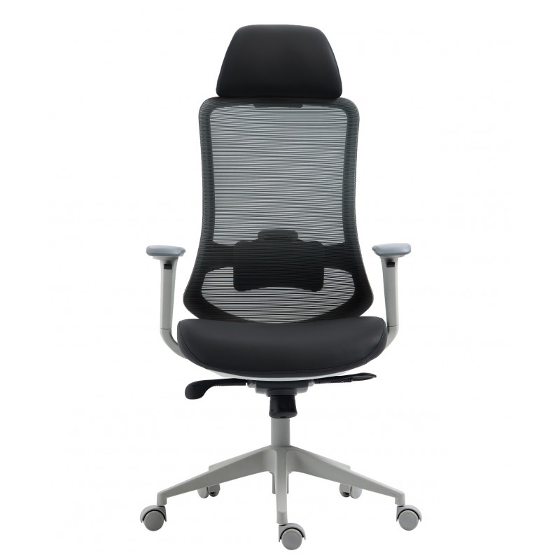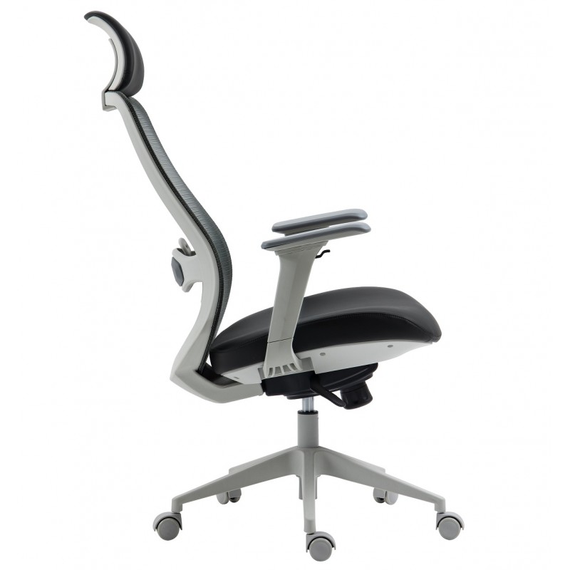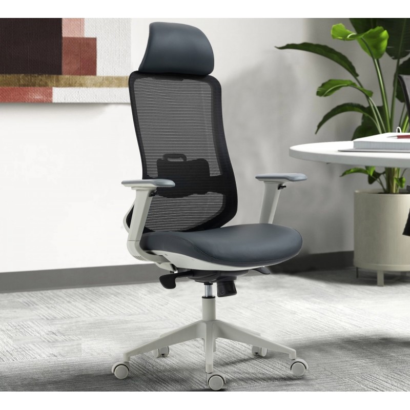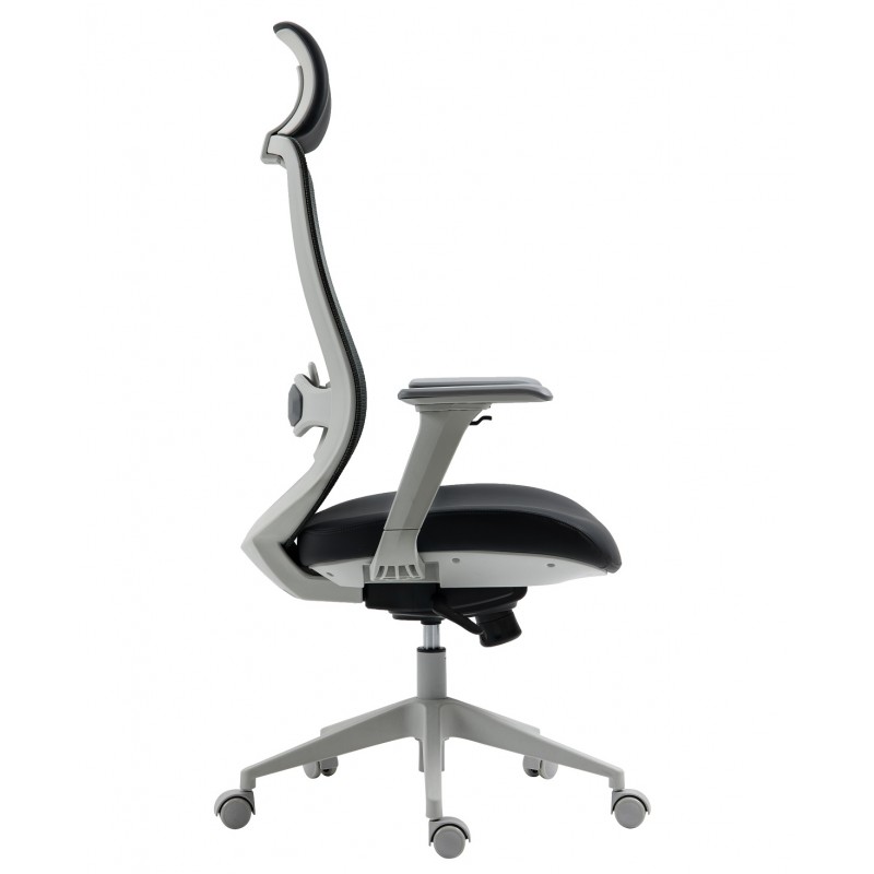 The structure is based on a sturdy nylon frame, coated with an elegant gray finish, ensuring lightness and strength. The very high backrest, equipped with an adjustable headrest, provides complete support for the spine and neck. The seat combines molded foam padding with a black synthetic leather covering, offering both softness and durability. The black translucent mesh backrest promotes ventilation for extended comfort.