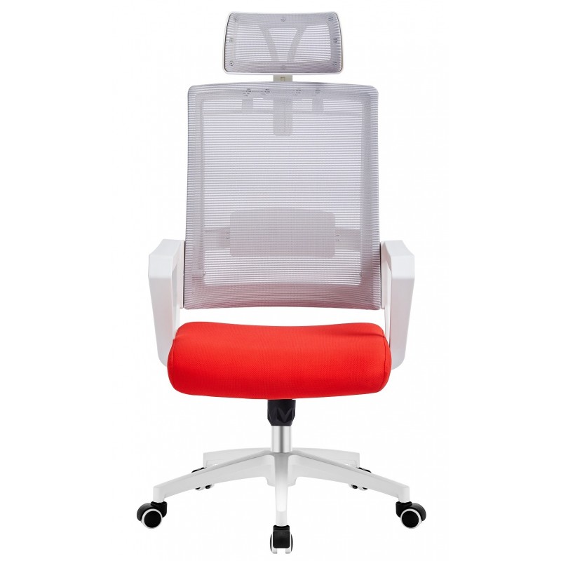 The structure is based on a frame and a white polypropylene base reinforced with fiberglass, ensuring strength and lightness. The backrest features a breathable gray mesh covering, offering excellent ventilation and adaptable support. The seat, upholstered in red acrylic fabric, adds a touch of vibrancy while ensuring durability for daily use. This chair combines technical materials and meticulous finishes for optimal durability.