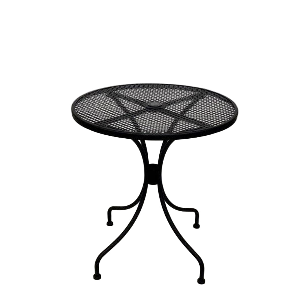 This black metal mesh outdoor table is designed for professional environments such as restaurants,