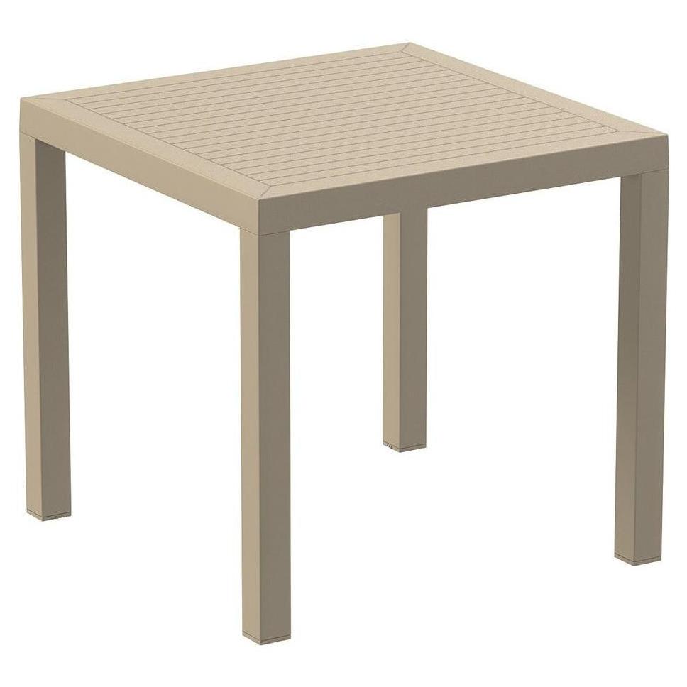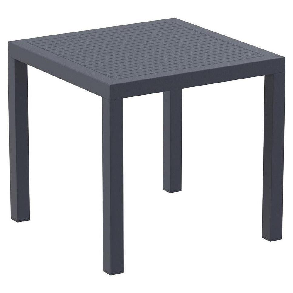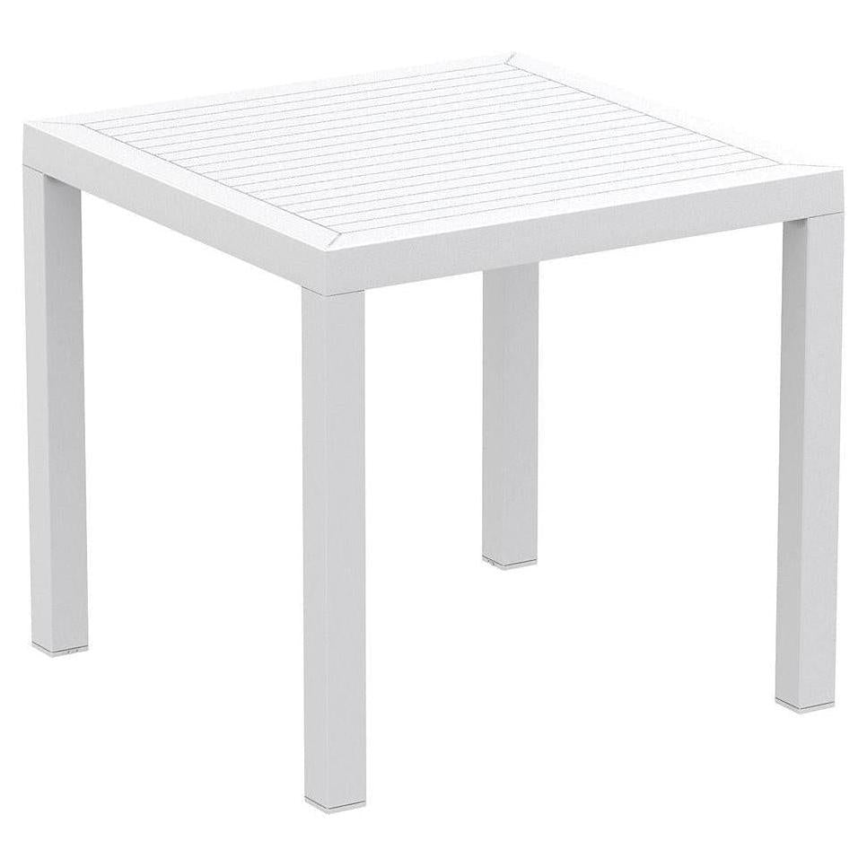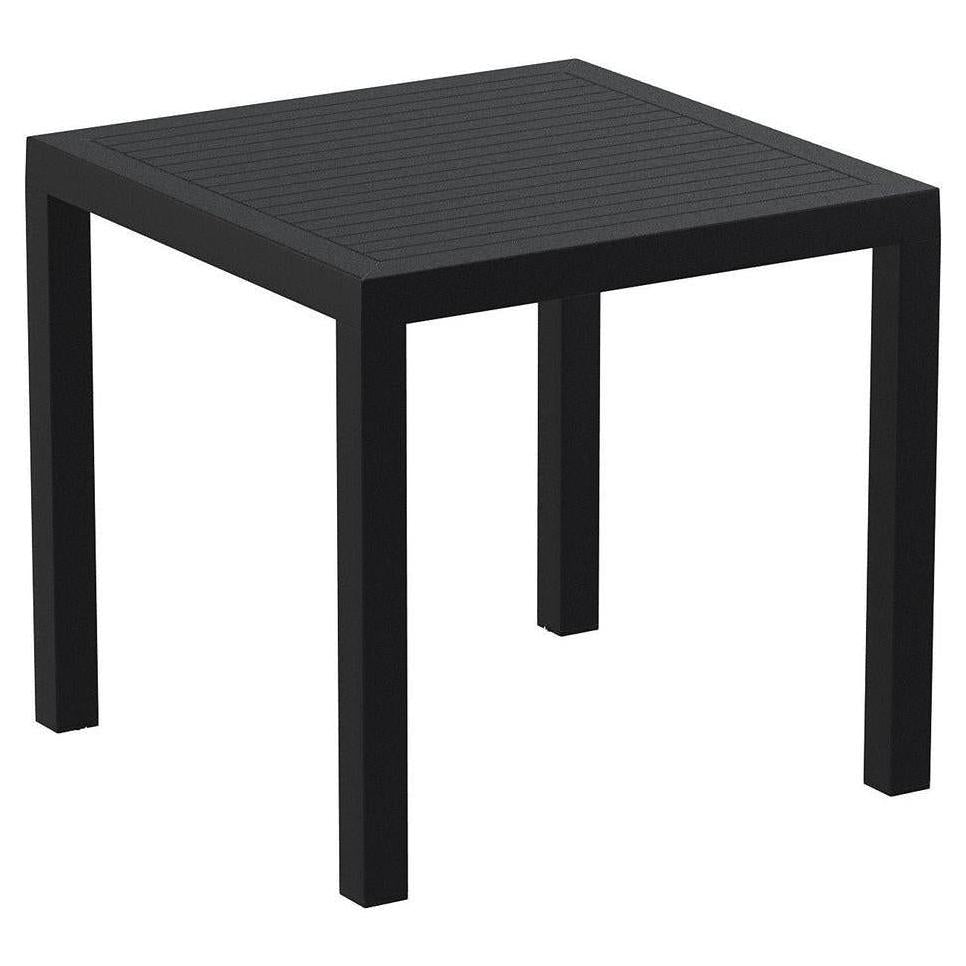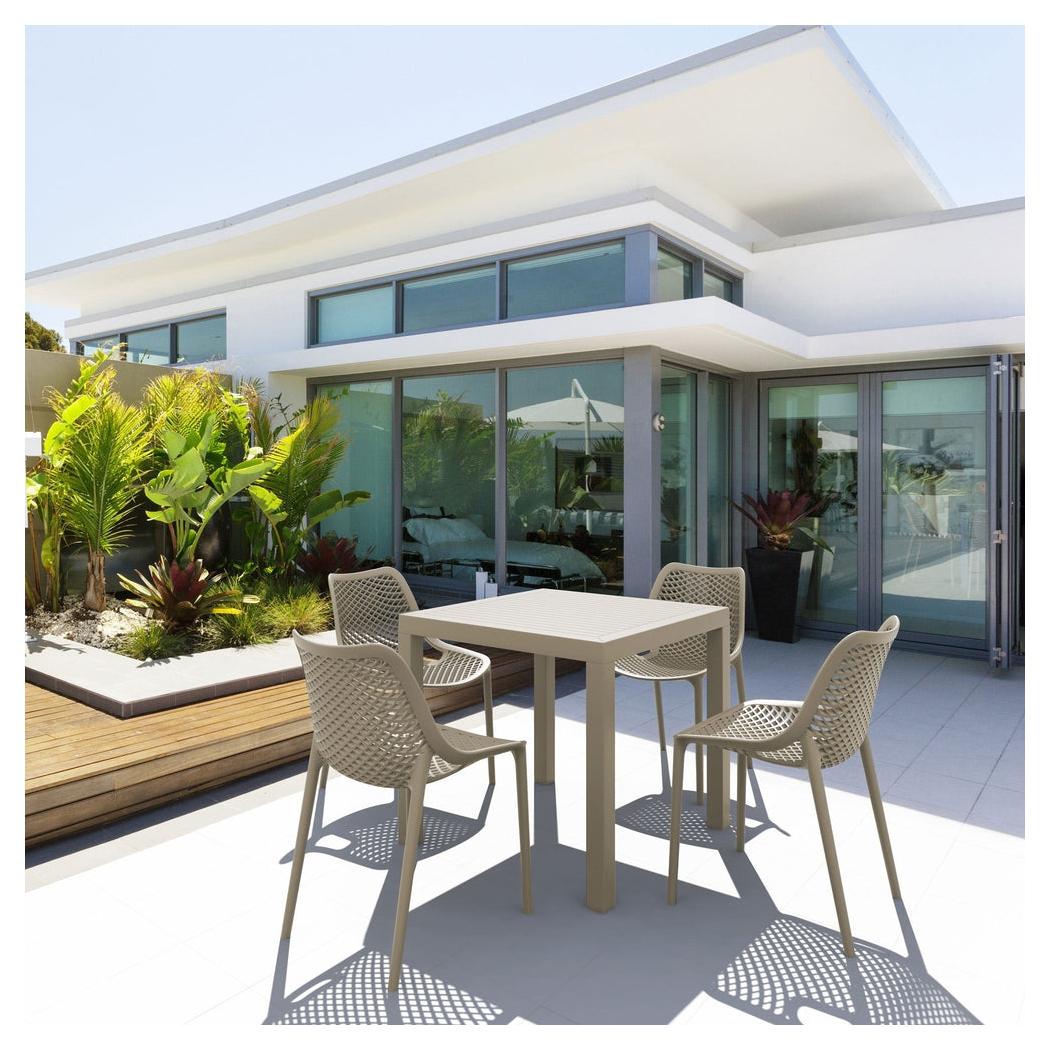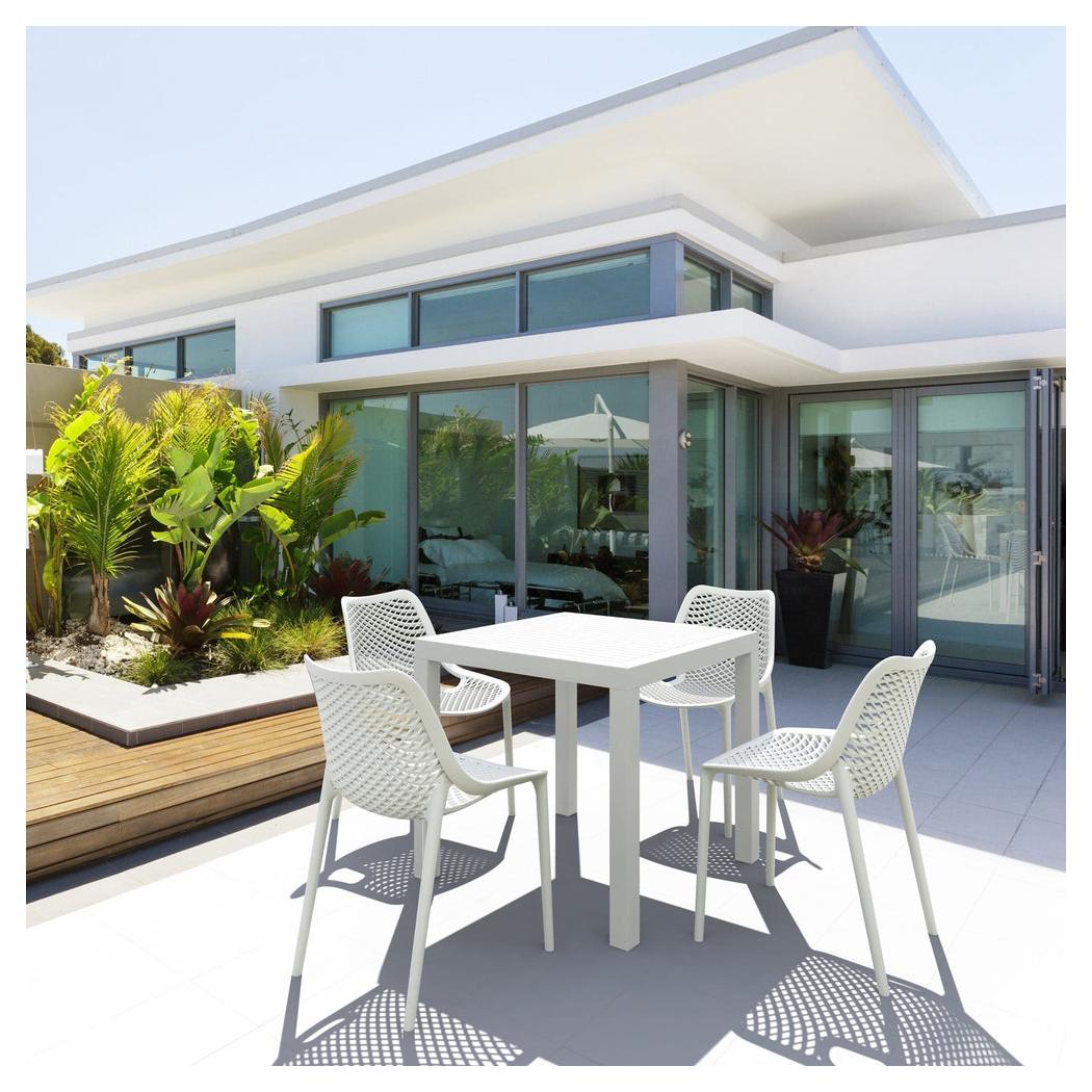 This outdoor dining set includes a square table and four chairs, designed for heavy commercial use,