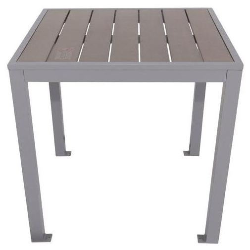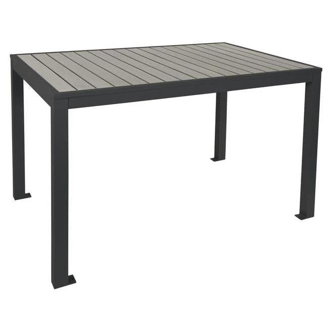 This bolt-on outdoor table features a modern and sleek design, ideal for outdoor dining spaces.