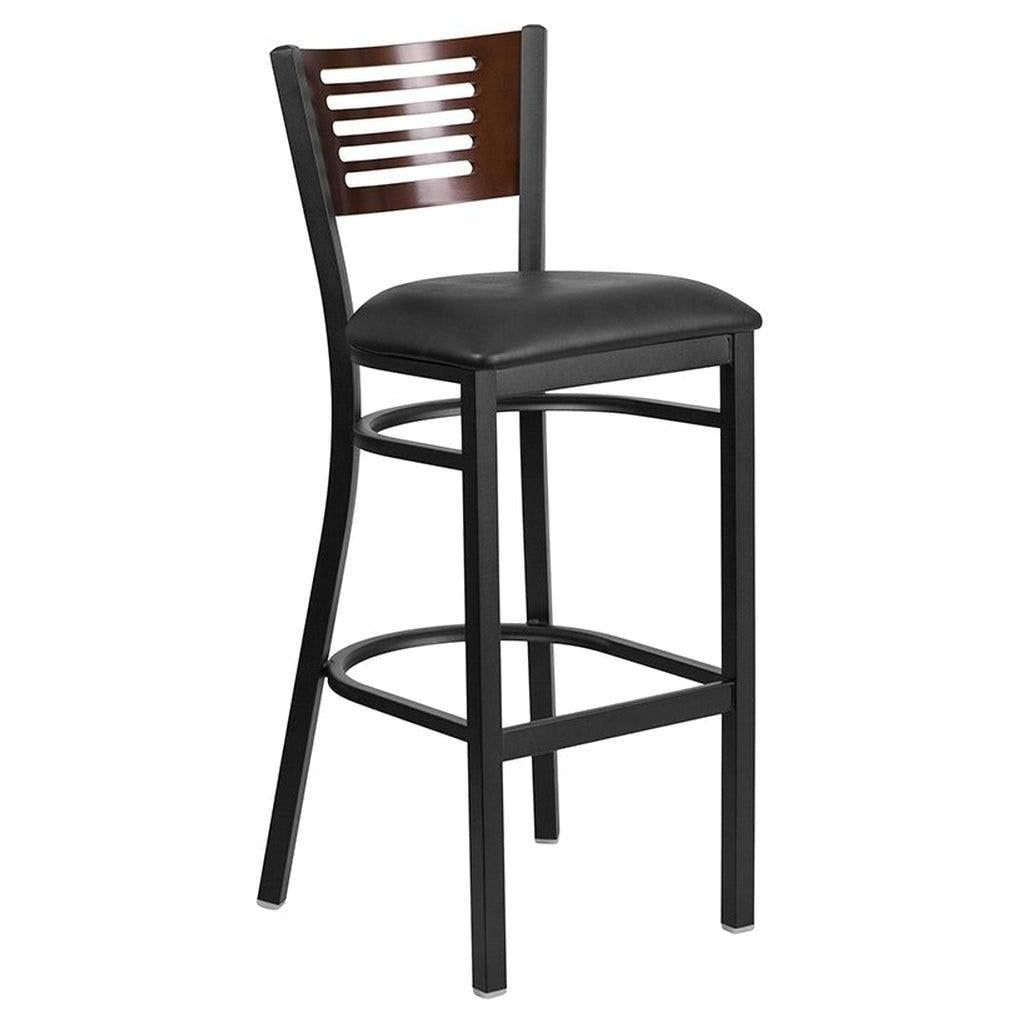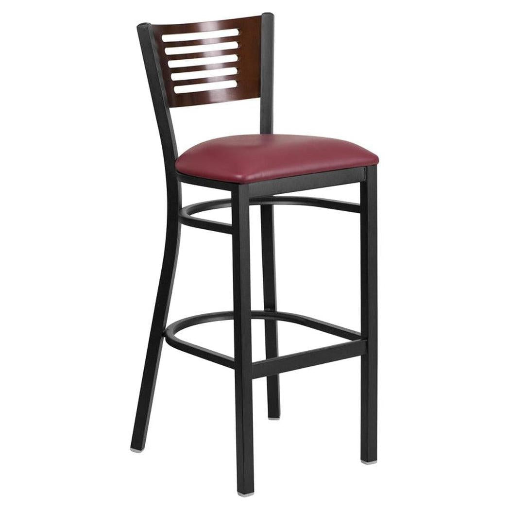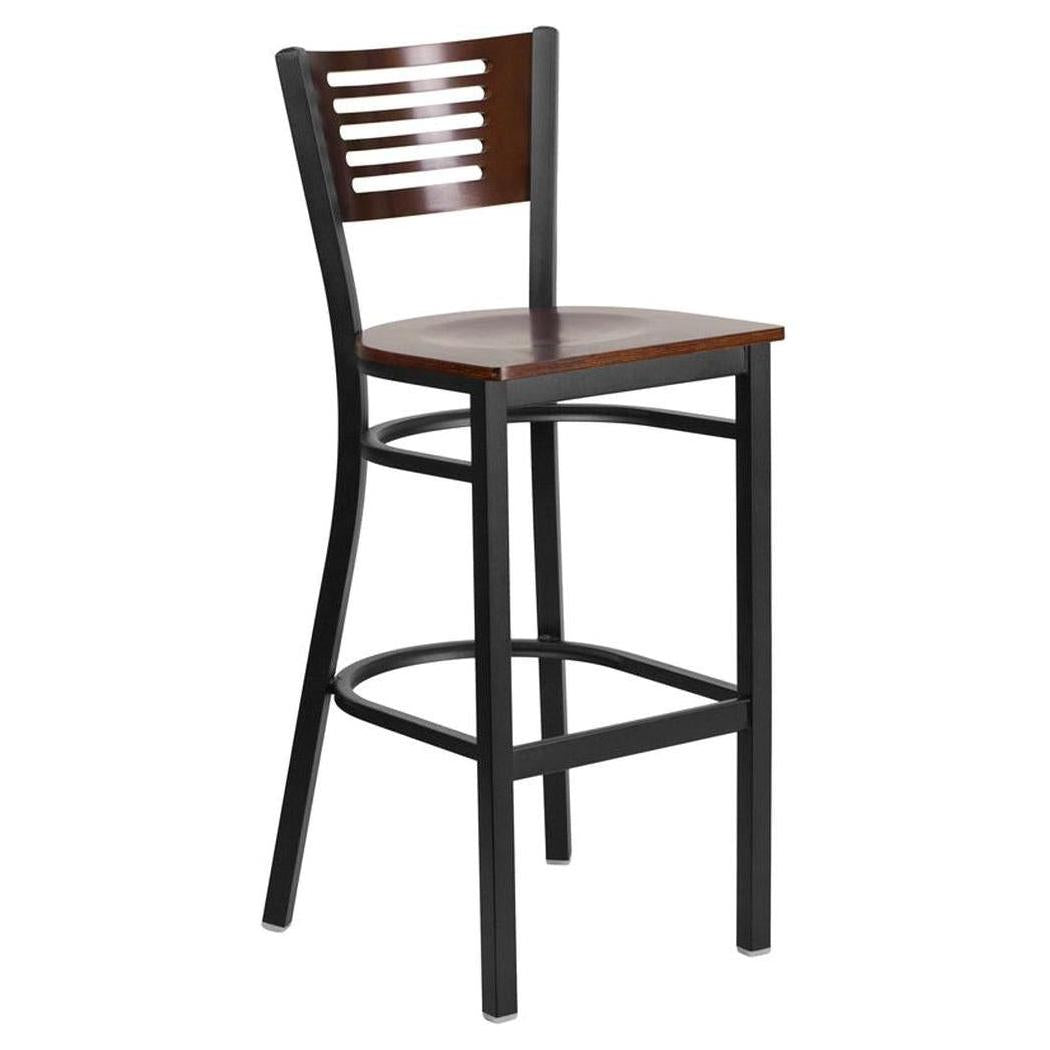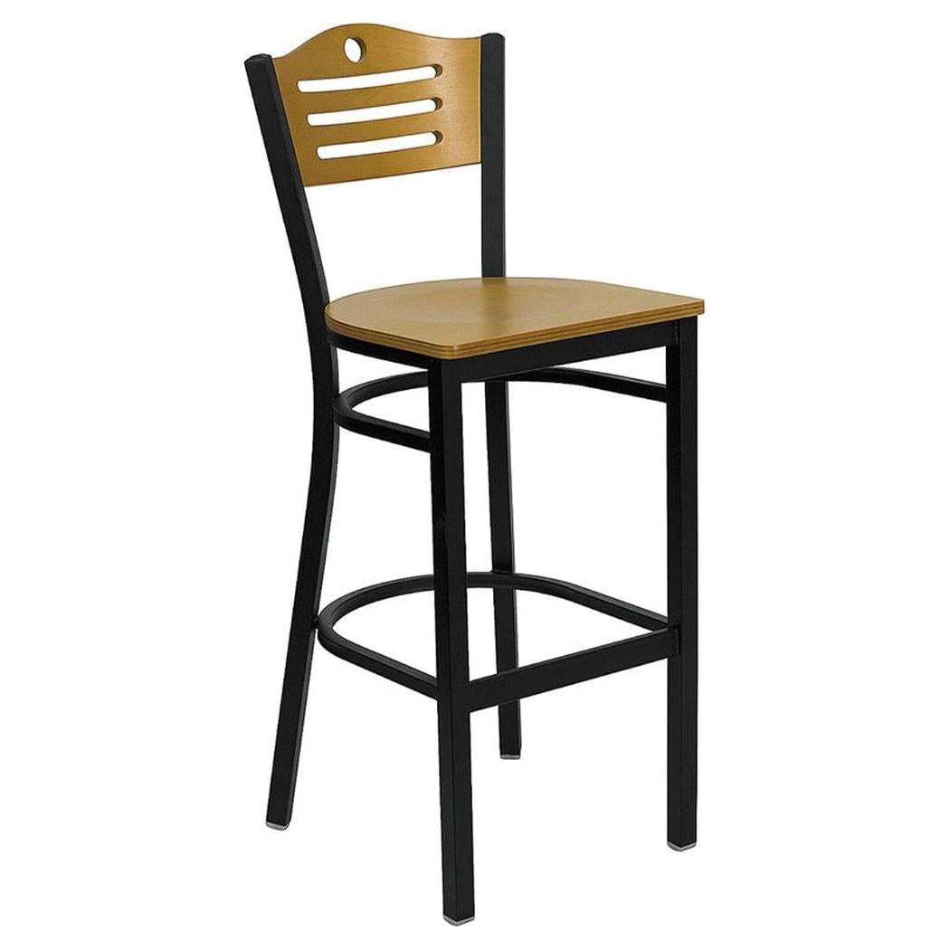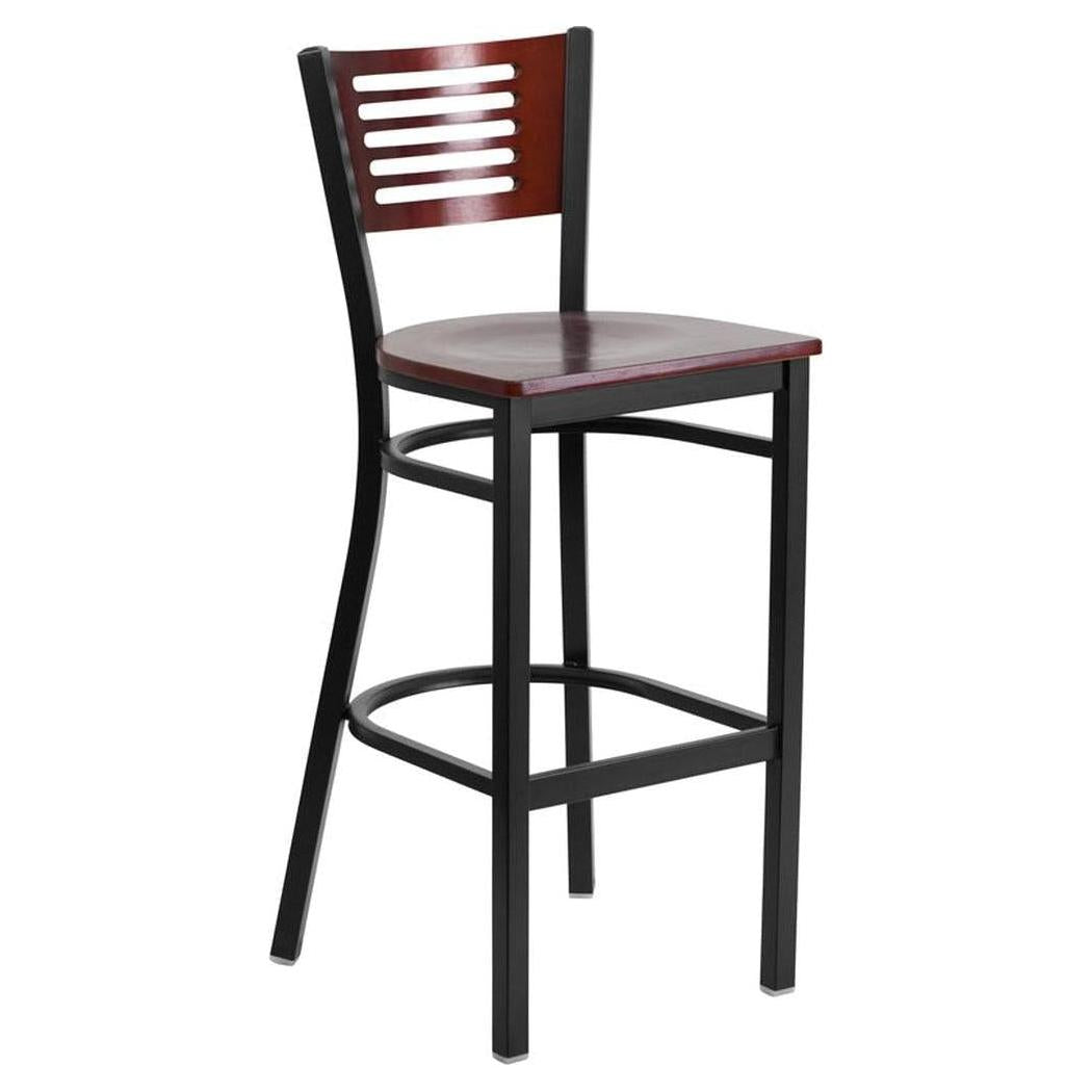 This metal bar stool is designed for professional environments such as restaurants, bars, and lounges,