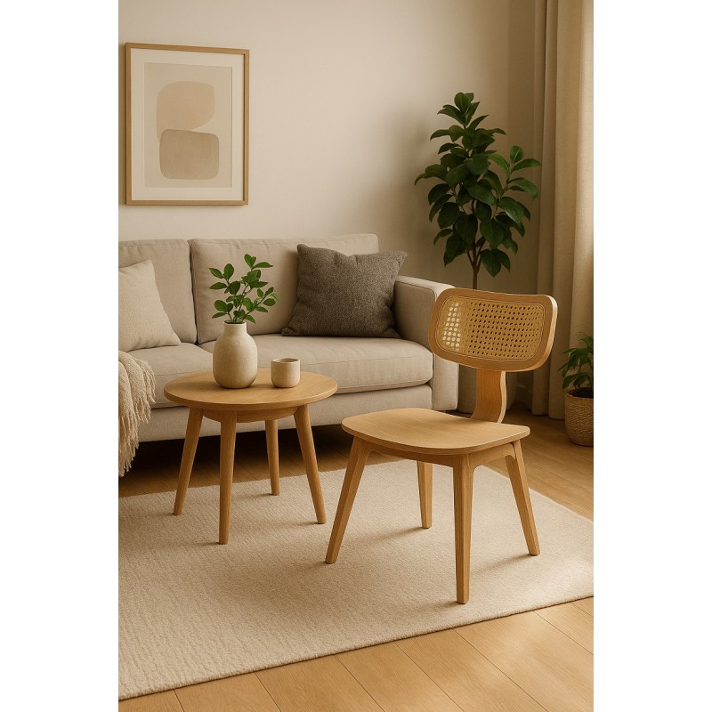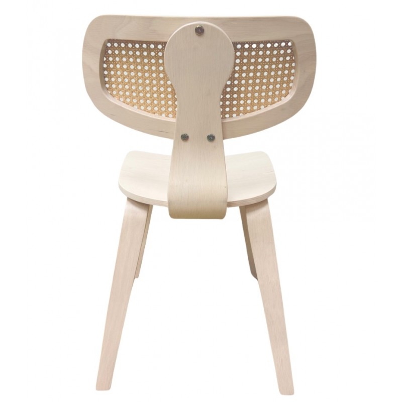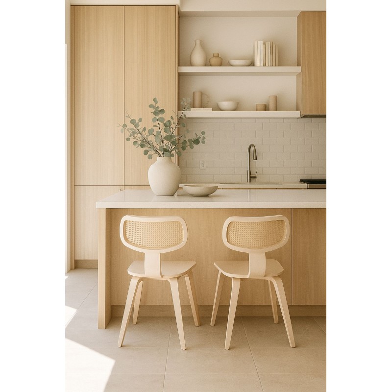 The structure is based on hevea plywood, known for its strength and durability. The natural wood maintains its warm appearance and blends well with different decoration styles. The backrest incorporates rattan work that provides good support while adding a touch of artisanal elegance. The choice of plywood ensures excellent stability and resistance to repeated stress.