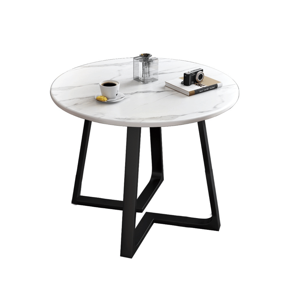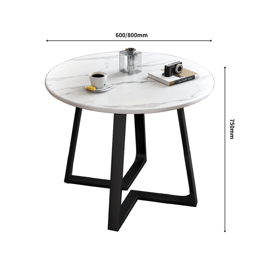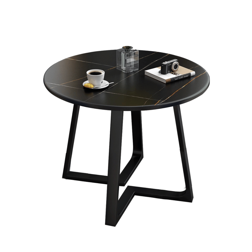 The table features a sintered stone top, offering an elegant and easy-to-maintain surface. Its round design eliminates sharp angles, ensuring safe use. The black textured metal legs provide optimal stability.