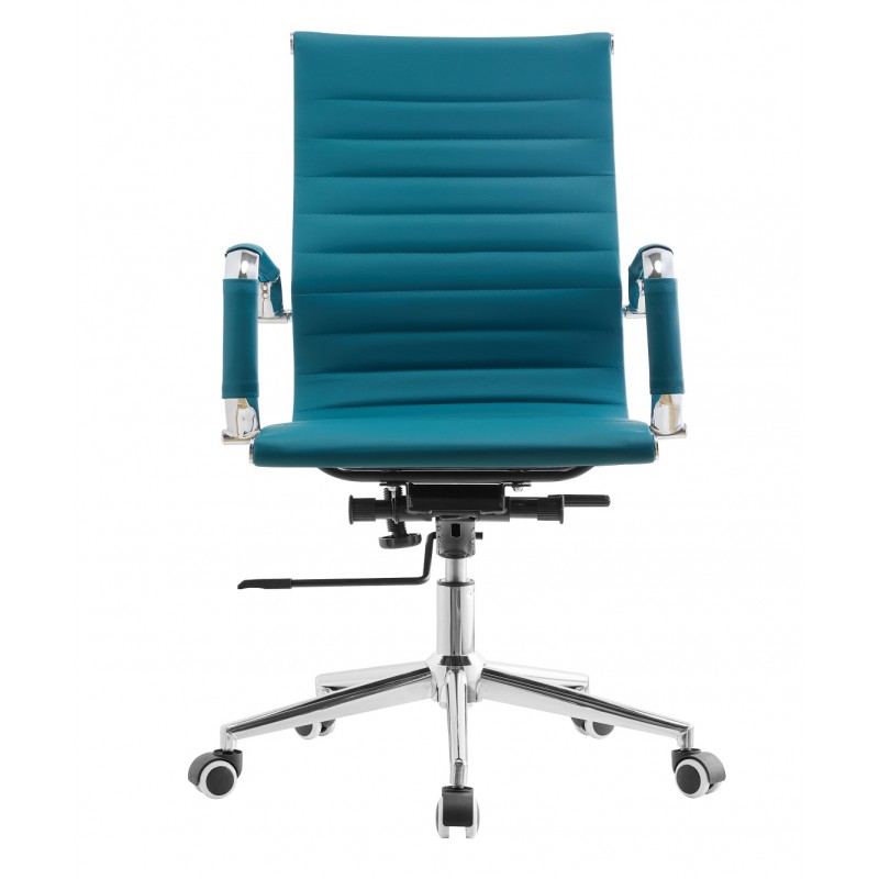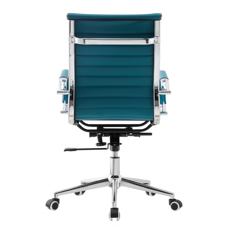 The structure is supported by a highly robust chrome steel base, ensuring stability and durability. The chrome armrests provide comfortable support while highlighting the elegance of the design. The seat and backrest are upholstered in turquoise synthetic leather, reinforced by horizontal stitching for aesthetic appeal and increased wear resistance. A chrome-finished gas lift allows for precise height adjustment.