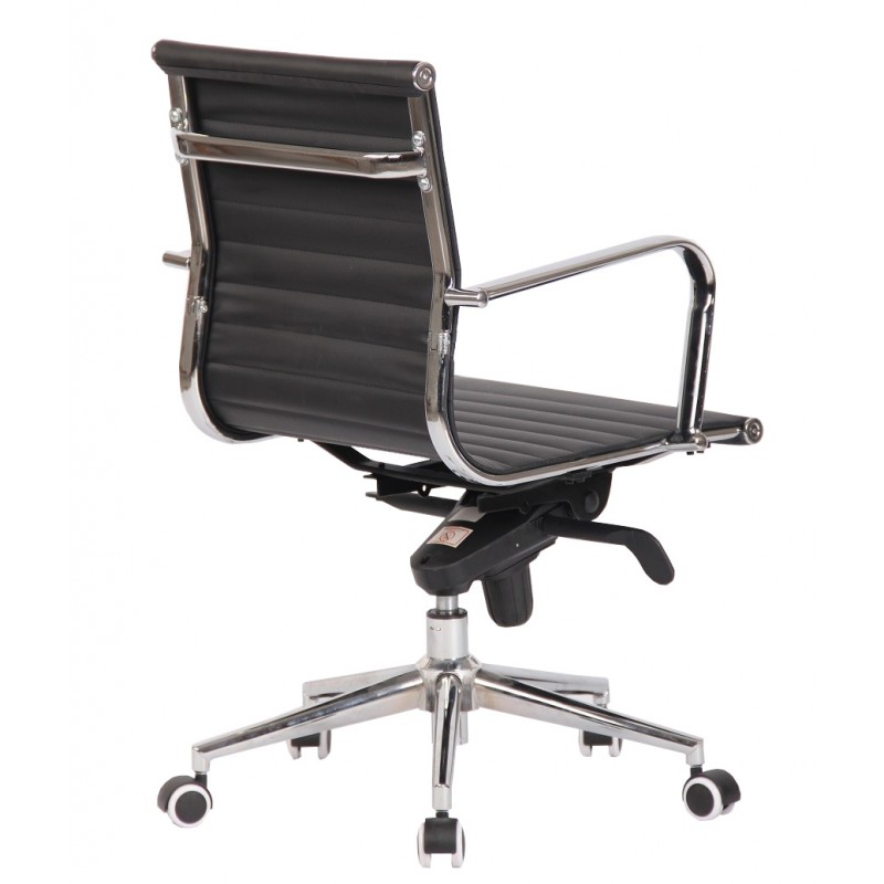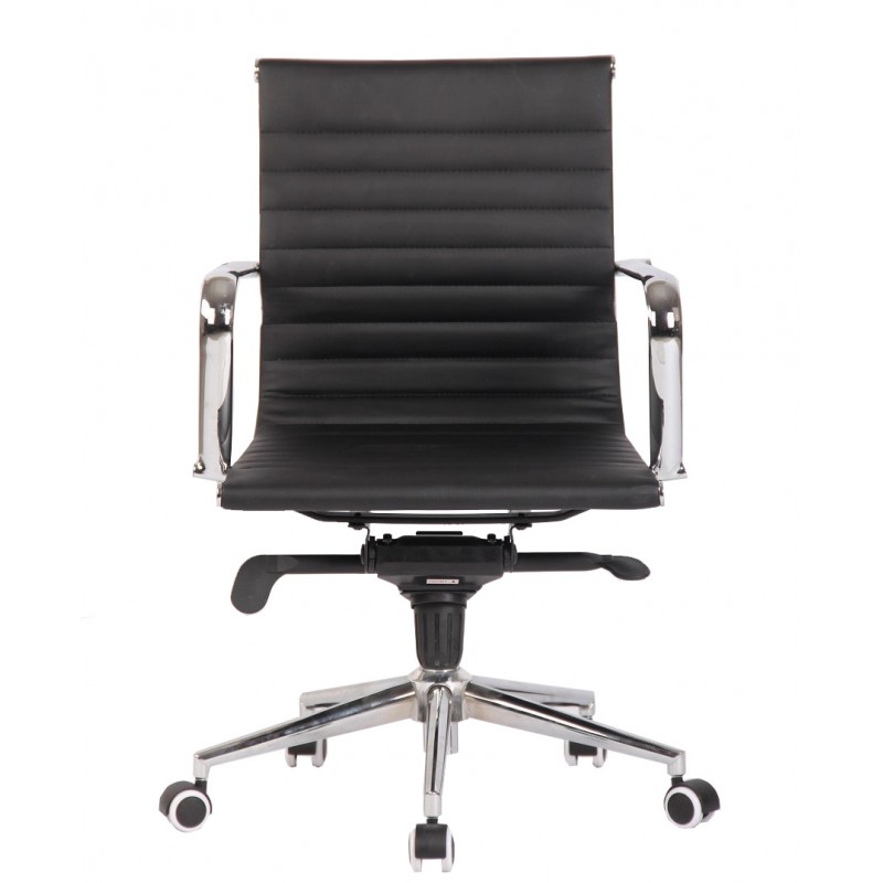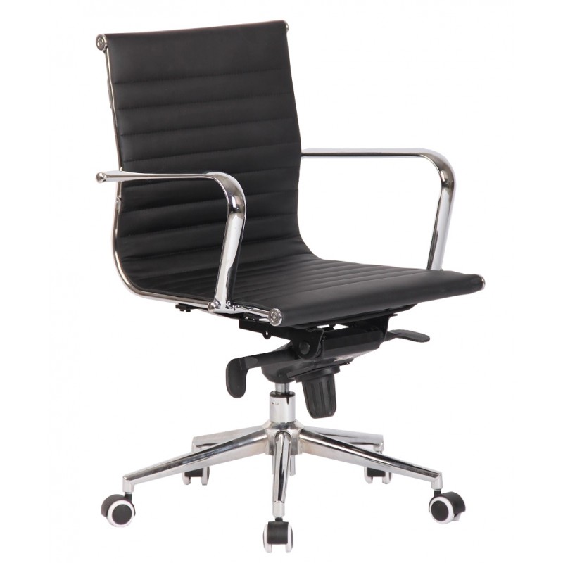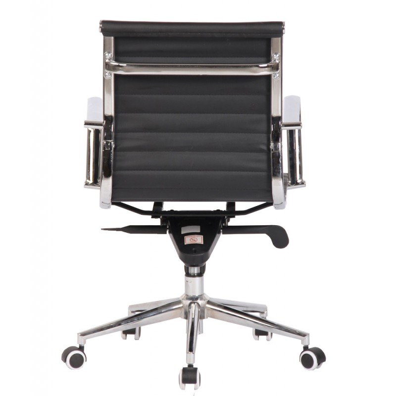 The structure is based on a chrome steel base, ensuring robustness and stability. The chrome armrests provide an elegant finish and increased strength. The padded seat and back, covered in black synthetic leather, ensure optimal comfort while facilitating maintenance. The intermediate backrest, adorned with horizontal seams, offers good lumbar support without visual clutter. This chair combines noble materials and contemporary design to harmoniously integrate into various professional environments.