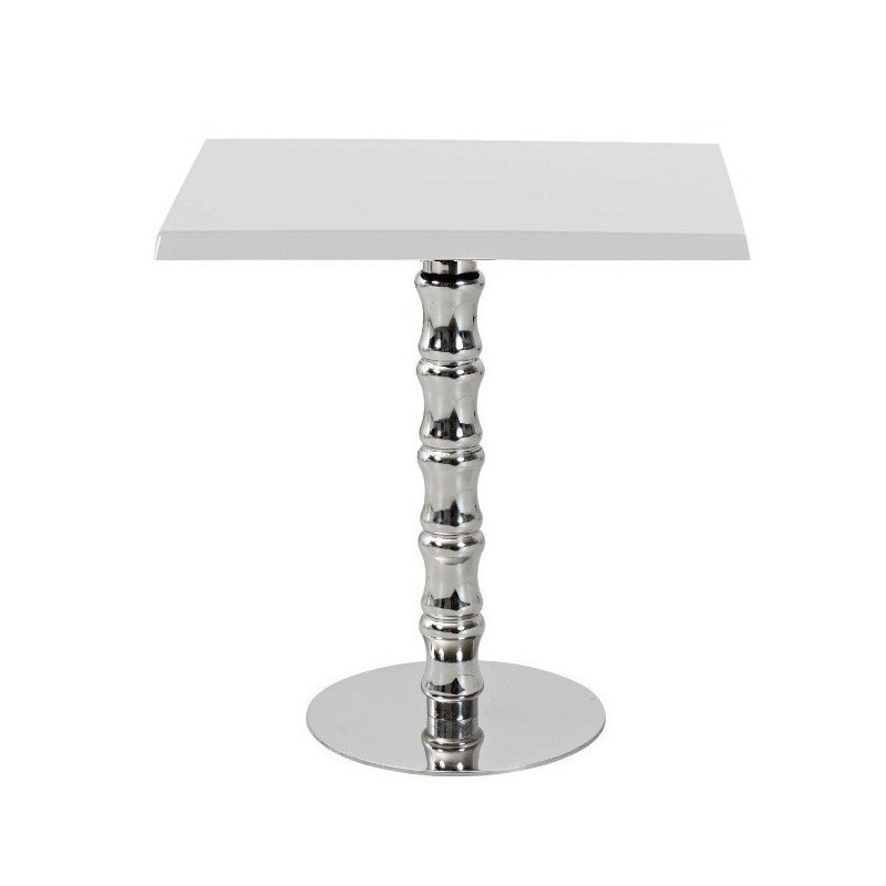The base is made of stainless steel with a mirror finish, ensuring strength and contemporary aesthetics. The tabletop, available in various decorations, adds a personalized and refined touch to the whole. The base plate measures 45 cm, ensuring excellent stability. The chosen materials combine durability and ease of maintenance, essential for professional furniture subjected to intensive use.