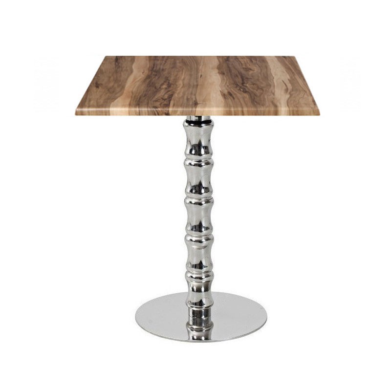 The stainless steel base with a mirror finish ensures strength and stability while offering a contemporary and refined aesthetic. The tabletop, available in different decorations, provides customization that meets the requirements of the location and style. Stainless steel ensures excellent resistance to wear and facilitates daily maintenance, essential in professional environments.
