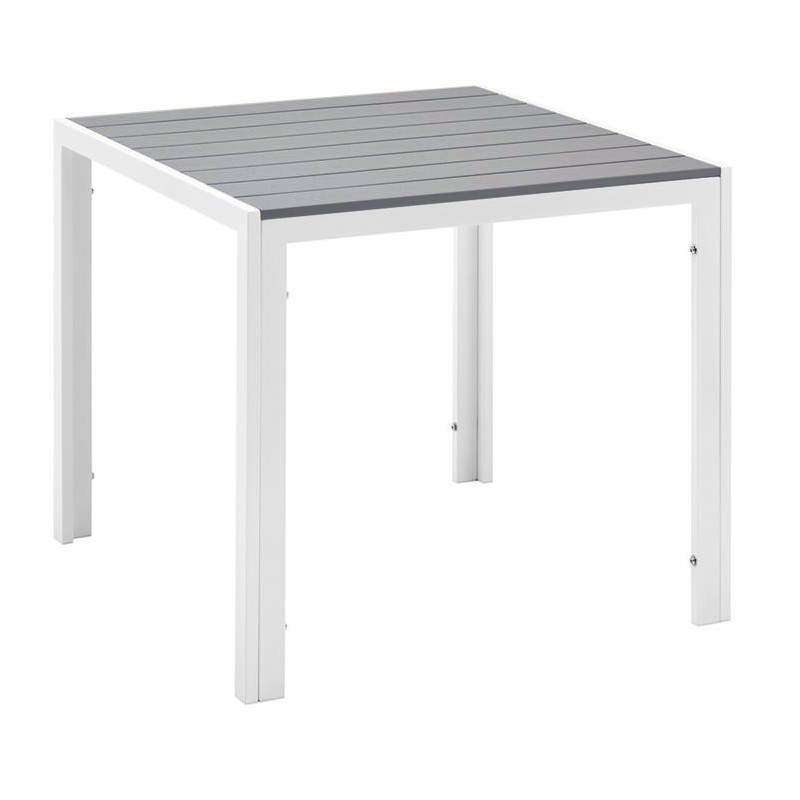 The tubular base, painted white, ensures excellent stability while adding a modern aesthetic touch. The gray polywood top, mainly made from recycled high-density polyethylene, mimics the appearance of wood while providing increased resistance to weather conditions and UV rays. This composition ensures remarkable durability and minimal maintenance, ideal for environments subject to variable conditions.