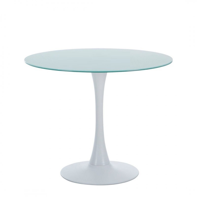 The table sits on a circular metal base with a diameter of 50 cm, providing enhanced stability. The tabletop is made of 10 mm thick tempered glass, treated with a white finish that brings brightness and modernity to the whole piece.