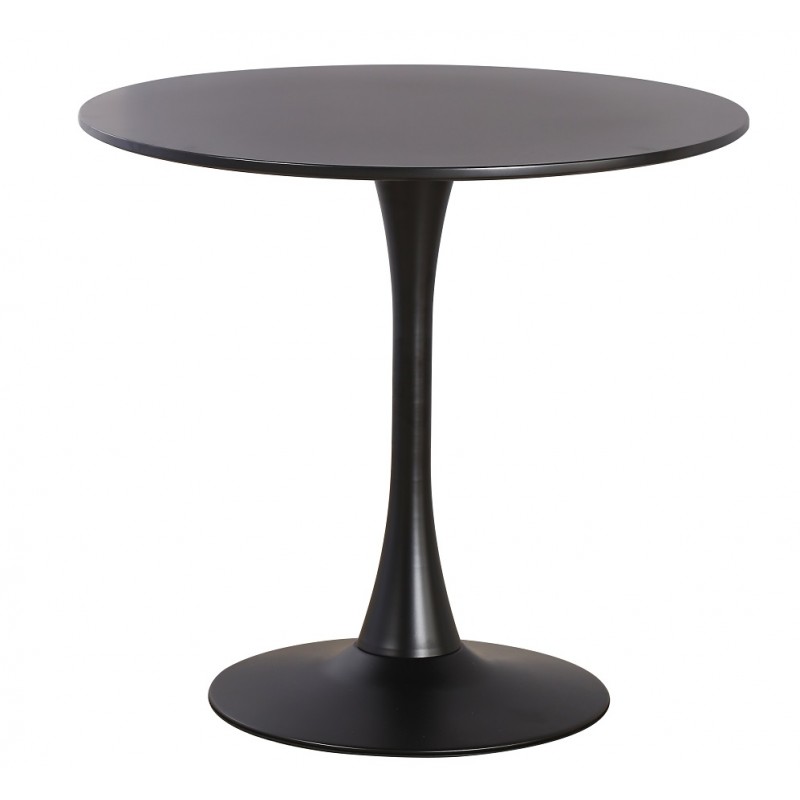 The table rests on a 50 cm diameter metal base, covered with black lacquer paint for robustness and elegance. The 19 mm thick Medium Density Fiberboard (MDF) top, also black lacquered, ensures a smooth and resistant surface. The combination of these materials guarantees good stability and durability suitable for intensive use.