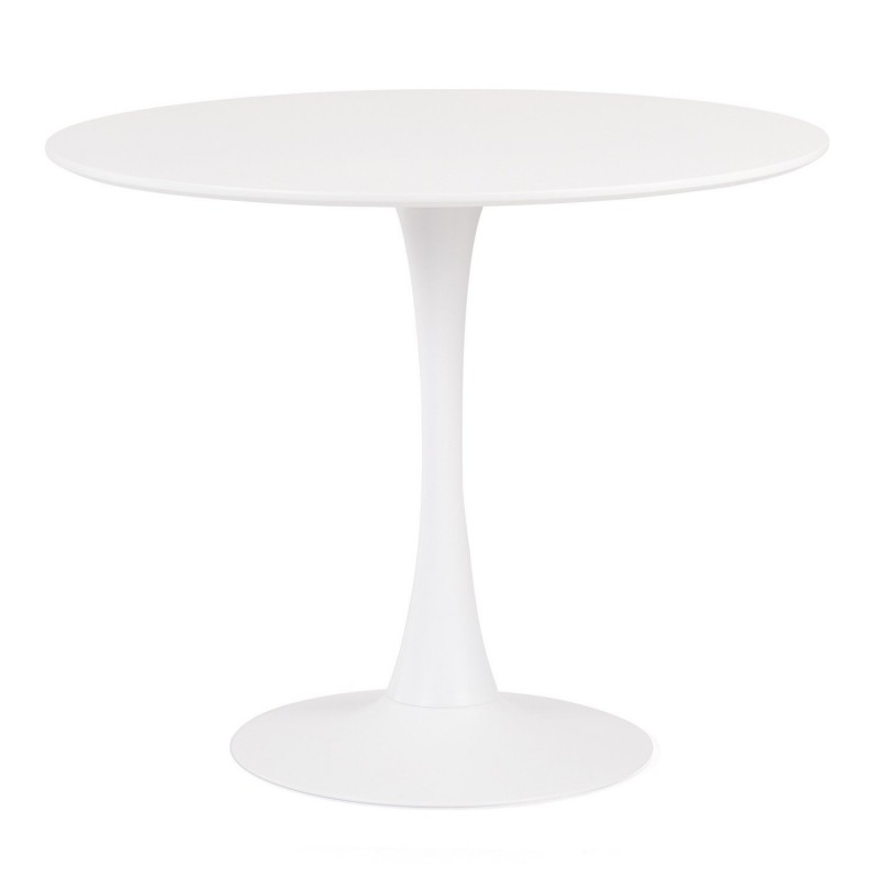 The tabletop is made of 19mm white lacquered medium-density fiberboard (MDF) for a smooth and easy-to-clean surface. The metal base, with a diameter of 60 cm, provides stability and robustness to the whole structure. It is covered with white lacquer paint that complements the modern aesthetic of the table.