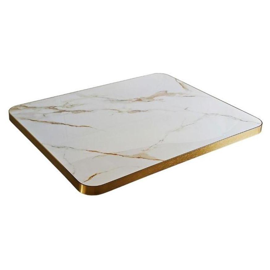 This table top in white marble fritted stone with golden veining is designed for professional use,