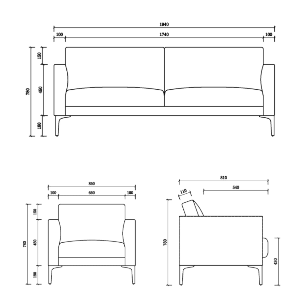 – Dimensions: 1940 mm width, 810 mm depth, 780 mm height