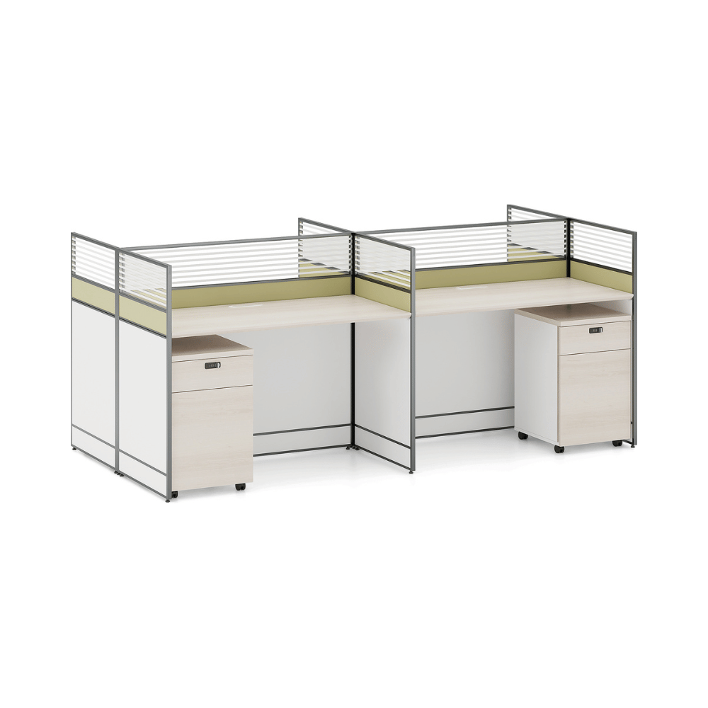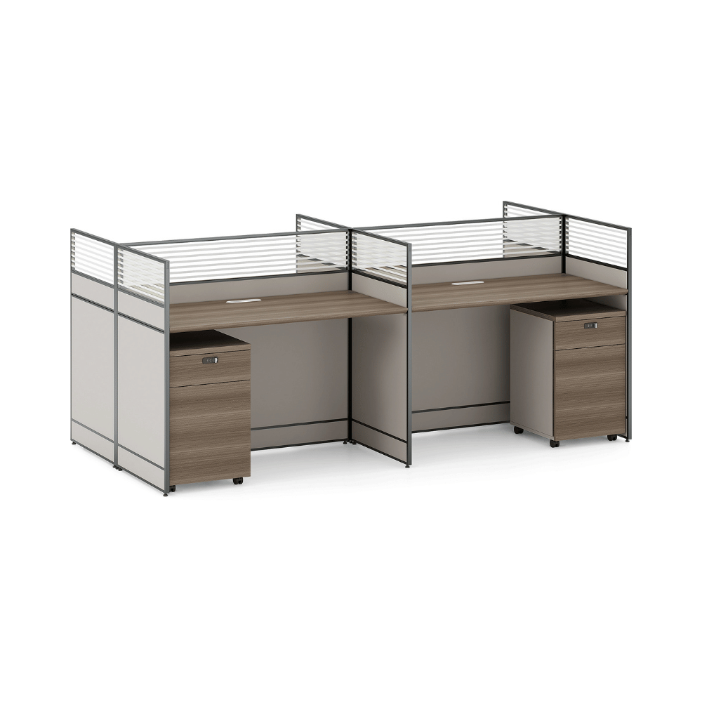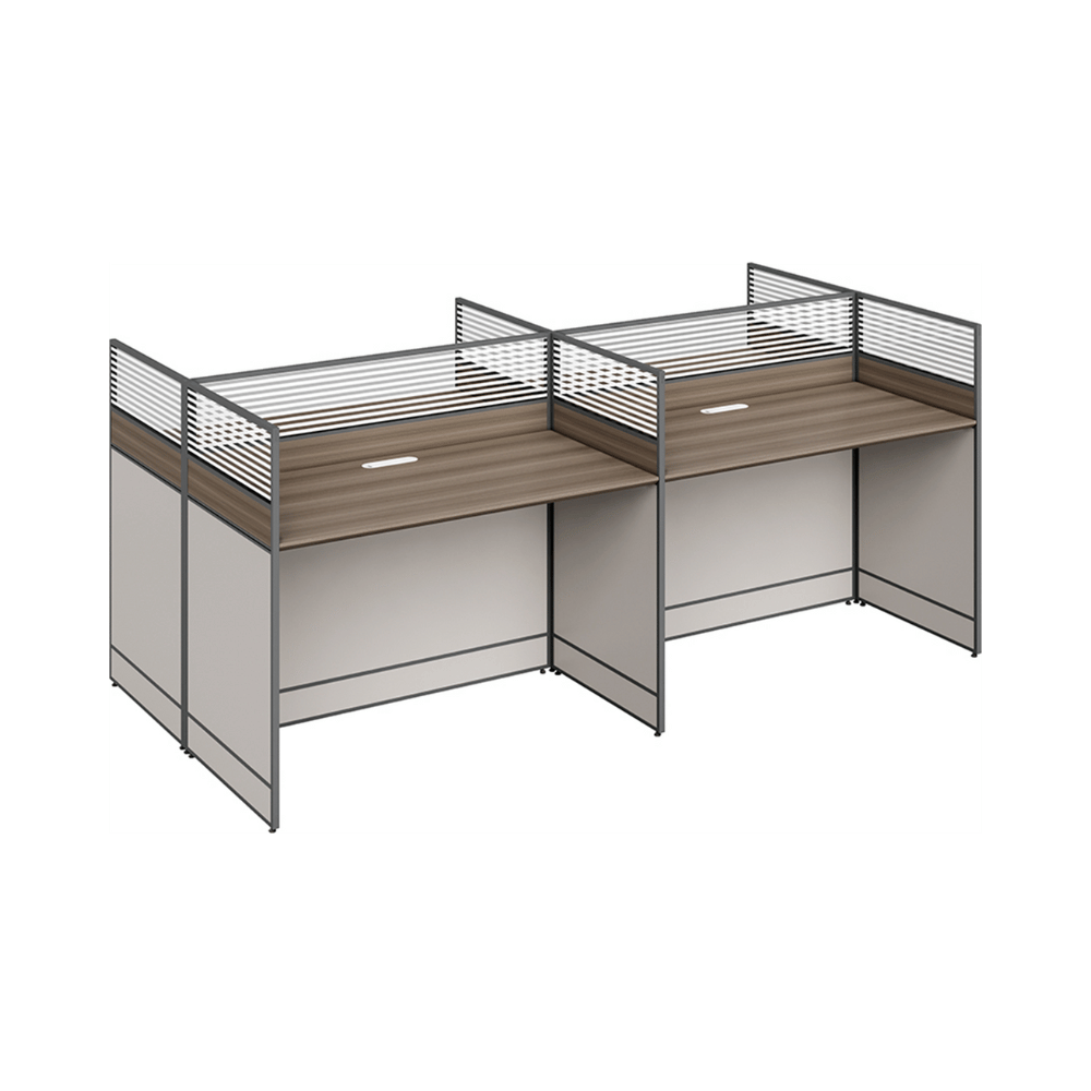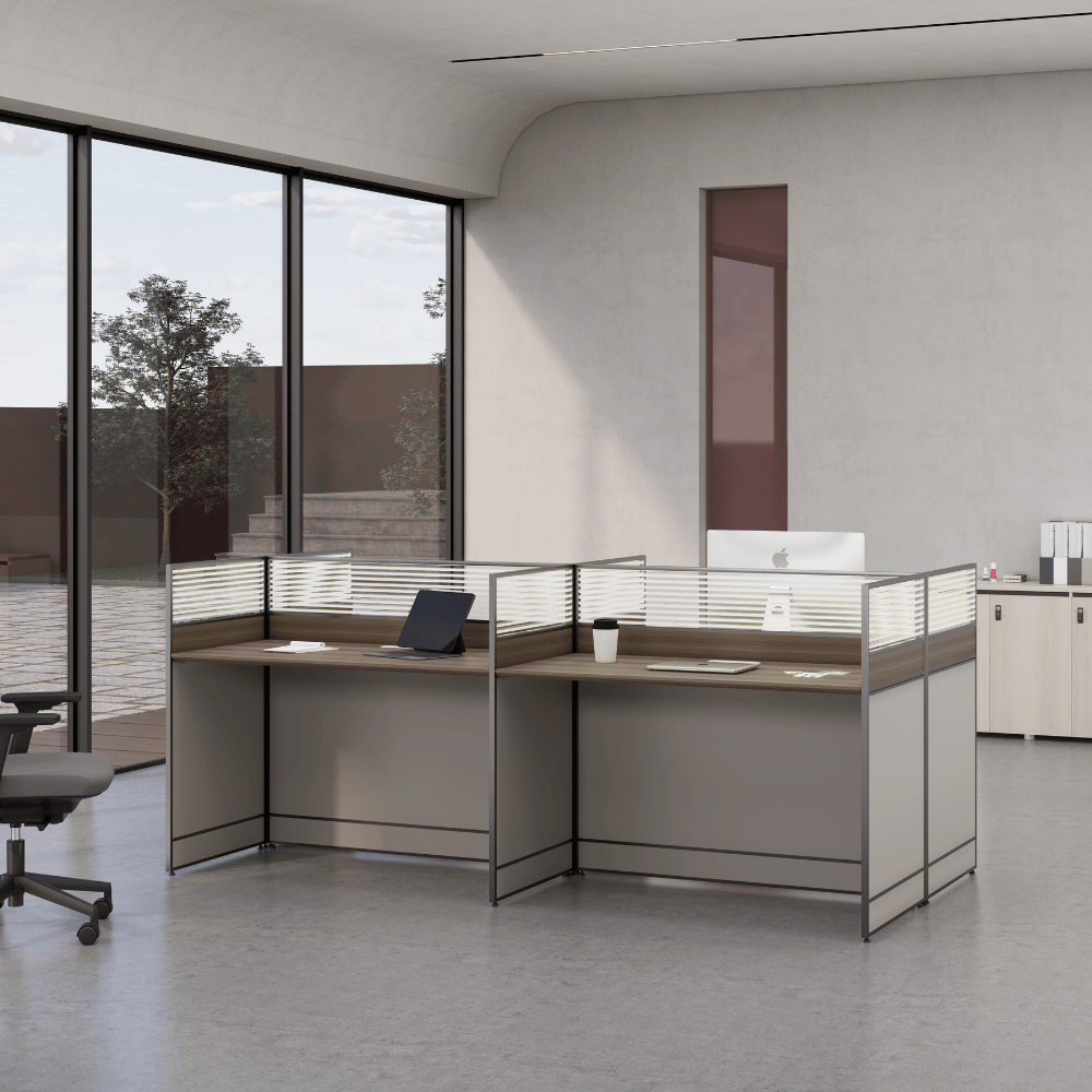 The desk features a 25mm thick wooden top, providing a sturdy work surface. The partition panels are available in different finishes, allowing customization of the space’s aesthetics. The design promotes efficient cable management, contributing to an organized work environment.