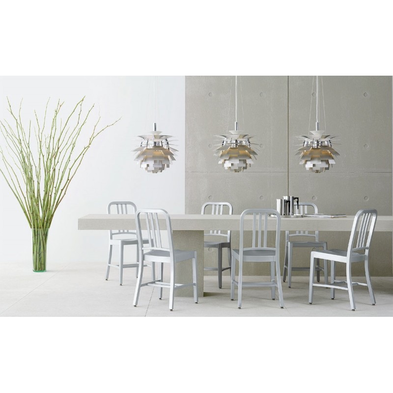 The structure is made of aluminum, a lightweight and durable material that ensures long-lasting performance. Its silver finish gives it a shiny metallic appearance, easy to integrate into various professional decorative styles. The pendant is delivered fully assembled, ready to be installed.