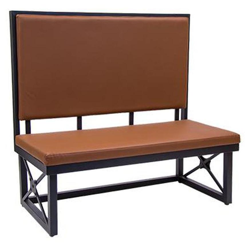 Bancos de restaurante modernos con estructura de metal negro y asiento/respaldo de vinilo marrón.