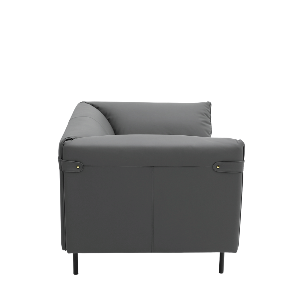 El sofá cuenta con una estructura de madera de alerce importada, garantizando estabilidad y durabilidad. Su acolchado de espuma de poliuretano moldeada ofrece un confort superior manteniendo su forma. El acabado en cuero de lujo y tela suave asegura una estética refinada y agradable al tacto.