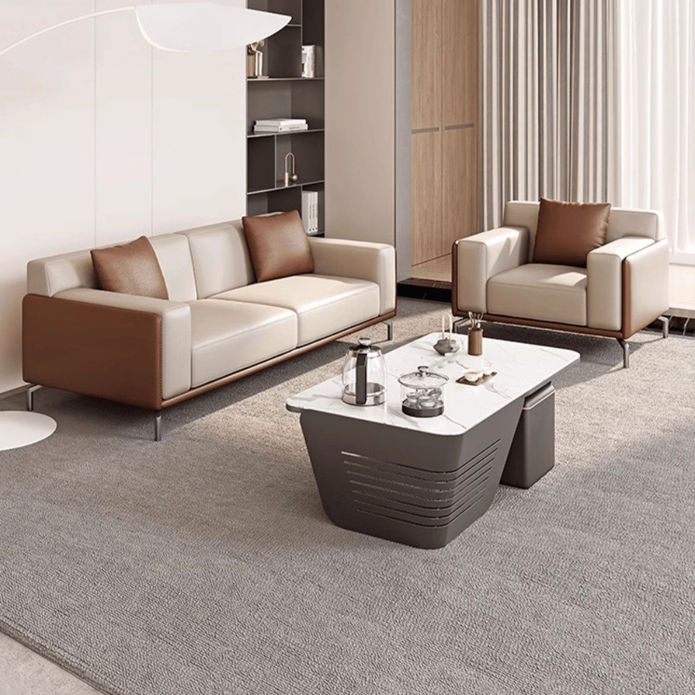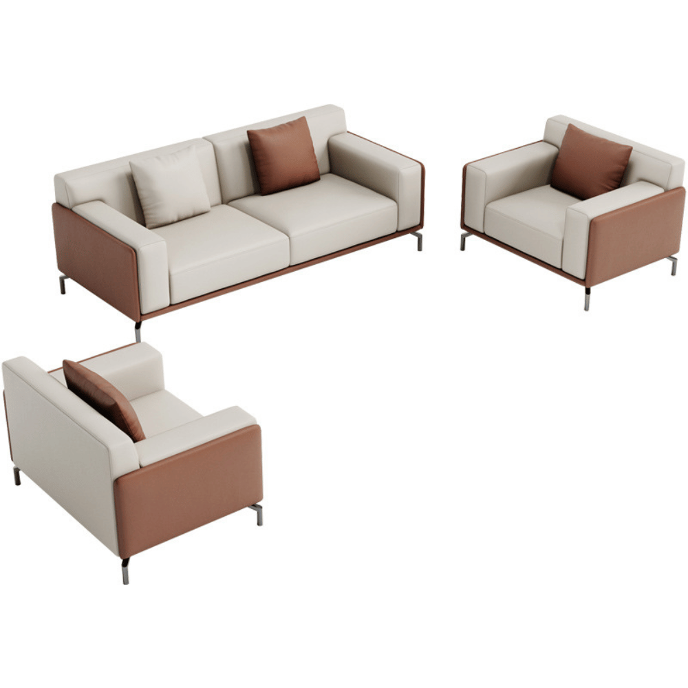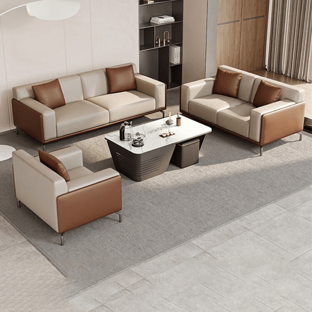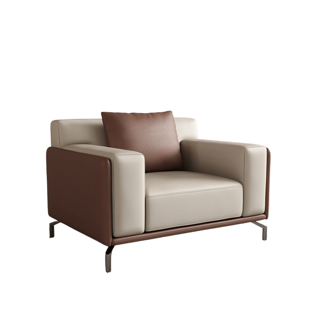 El sofá está construido sobre una estructura de madera de alerce importada, garantizando estabilidad y durabilidad. Está acolchado con espuma de poliuretano moldeada, ofreciendo un confort duradero sin deformaciones. El revestimiento de cuero grueso y tela suave asegura una estética refinada y una sensación agradable al tacto.