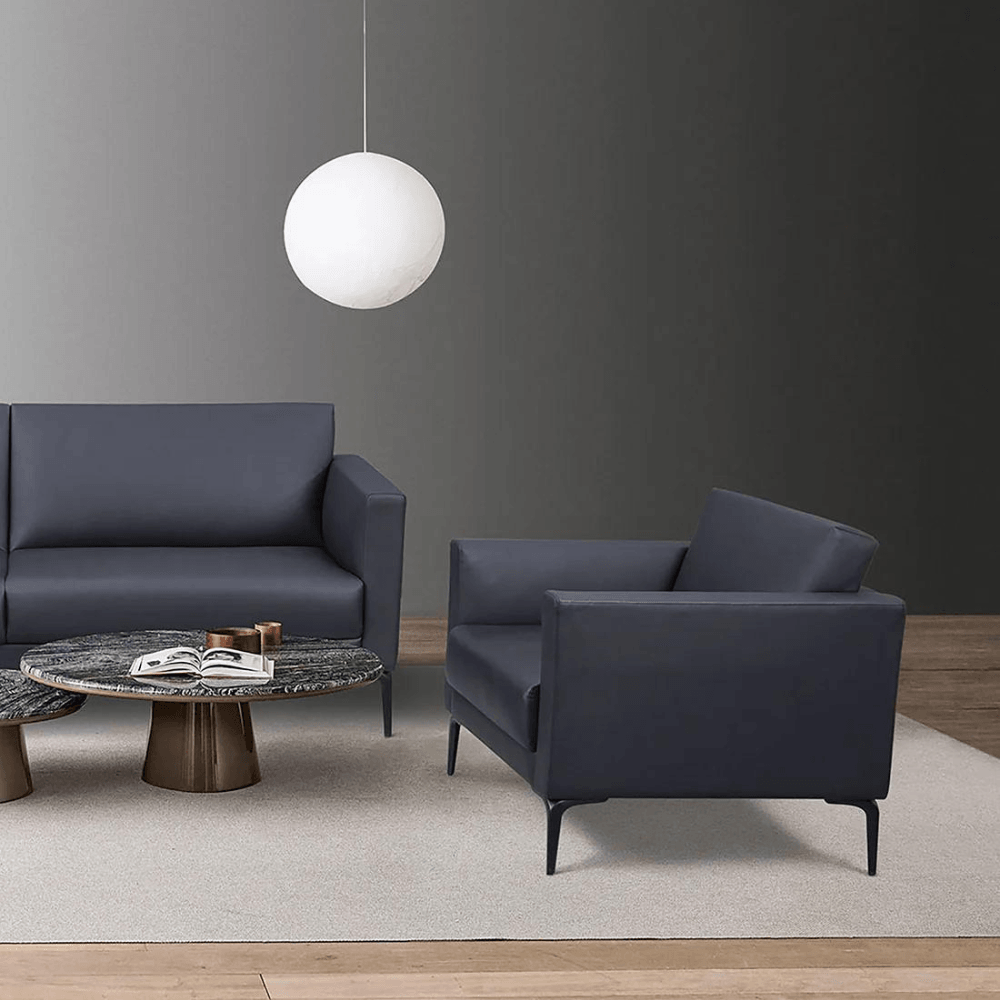 El sofá está fabricado en cuero PU de alta calidad o en cuero Pleven importado de Brasil. Descansa sobre una base de acero con acabado en polvo, garantizando robustez y estética. La comodidad está reforzada por una espuma de alta densidad de 40, mientras que el sistema de resortes de acero manganeso garantiza un soporte duradero y sin deformaciones.